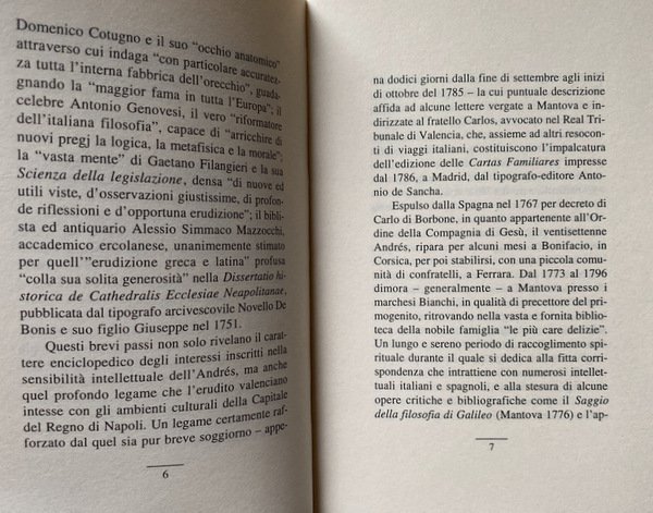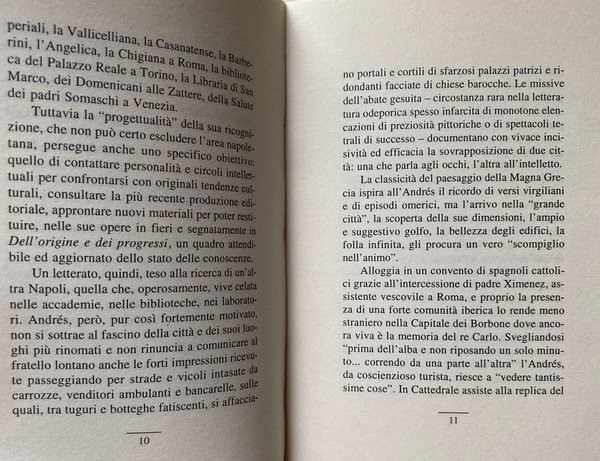 Vengono tradotte e pubblicate integralmente, per la prima volta in Italia, le quattro lettere "napoletane" del più ampio carteggio che Juan Andrés (Planes 1740, Roma 1817), figura di primo piano della diaspora di intellettuali gesuiti rifugiati in Italia, indirizza al fratello a Valencia. Erede di quell'enciclopedismo di tradizione ispano-italiana, Andrés, tra gli anni Ottanta e Novanta, intraprende una serie di viaggi nella penisola e, nel 1785, giunge a Napoli. Le sue impressioni, pur nella ricchissima letteratura di viaggio, restituiscono un'immagine tuttavia in consueta della Capitale del Regno di Napoli nel la seconda metà del Settecento. L'attenzione, infatti, non si esaurisce nella descrizione di chiese e palazzi, di strade e vicoli, di carrozze e folla vociante. L'erudito abate spagnolo cerca un'altra Napoli, quella che parla all'intelletto. I libri e i manoscritti conservati nelle biblioteche pubbliche e private, le antichità dei Campi Flegrei, Ercolano, Pompei e Portici, e gl'incontri con alcuni eruditi partenopei intendono documentare - lontano da sapori folcloristici e frivole mondanità - gli aspetti di un vivace panorama culturale di cui solo rarissimi viaggiatori sono riusciti a dare conto. Sull'Andrés scriverà il Tiraboschi: "Egli è un uomo veramente dotto, letterato tanto giudizioso e modesto, ed è mio amico, e se in qual che cosa ha dissentito da me l'ha fatto con quella urbanità che tra letterati si deve usare".