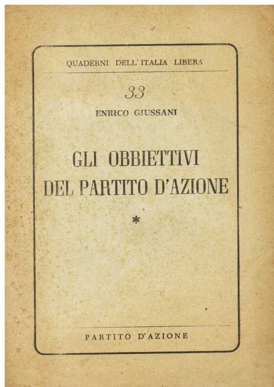 In-16°, pp. 16, brossura editoriale. Mancanza all'angolo superiore esterno del piatto posteriore. Quaderni dell'Italia libera, 33.
