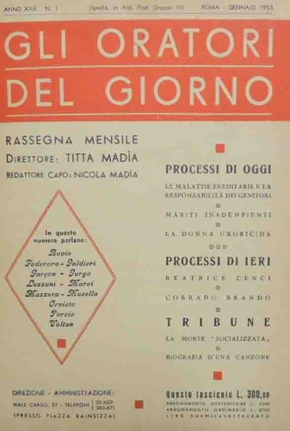 Gli oratori del giorno. Rassegna mensile (direttore: Titta Madia), Roma, anno XXV, nn. 1-12, gennaio-dicembre 1956, annata completa di 12 numeri (di cui due doppi: maggio-giugno e settembre-ottobre), pp. 60 circa per numero (pp. 72 cad. per i numeri doppi), per un totale di pp. 616, ill. b.n., cm 24, legatura in tutta tela con titoli in oro al dorso. Minime fioriture, leggera brunitura della carta, qualche sgualcitura, una piccola cifra annotata a biro sulla copertina del numero di febbraio, per il resto volume ben conservato e con legatura solida.