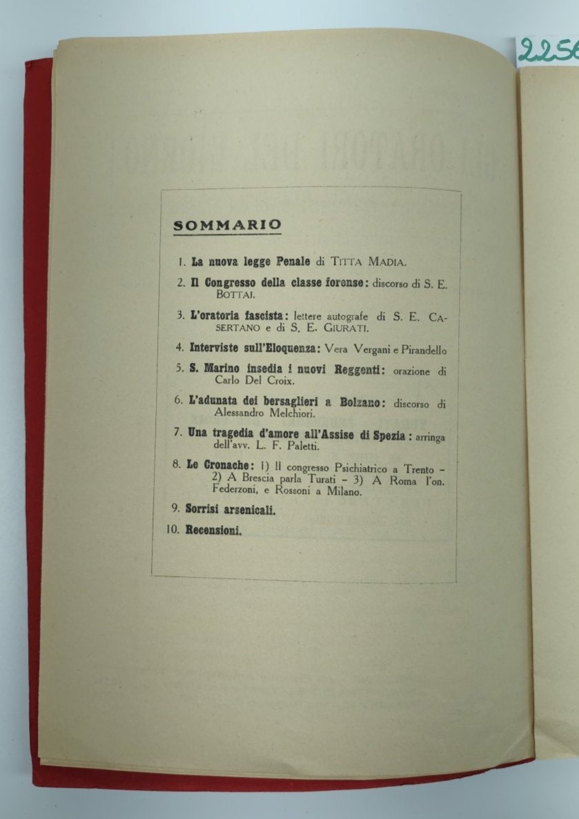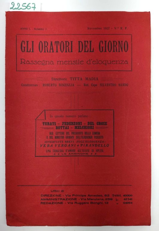 Rassegna mensile dell'eloquenza direttore Titta Madia legatura morbida editoriale con alcuni lievi aloni ai piatti, segni del tempo, una piega all'angolo inferiore che va interessare tutta la rivista, piccola mancanza all'angolo superiore alla quarta di copertina, pagine interne leggermente ingiallite, legatura leggermente allentata numero pagine 67 dimensioni cm 24,7 * 17,4