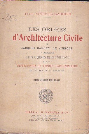In-16°, pp. 152, brossura originale. 38 tavole f.t. e 73 figure n.t. 12 illustrazioni fotografiche f.t. in fine riproducenti edifici del Vignola. Restauri alla brossura. Quinta edizione curata dal Garneri, con testo bilingue italiano e francese.