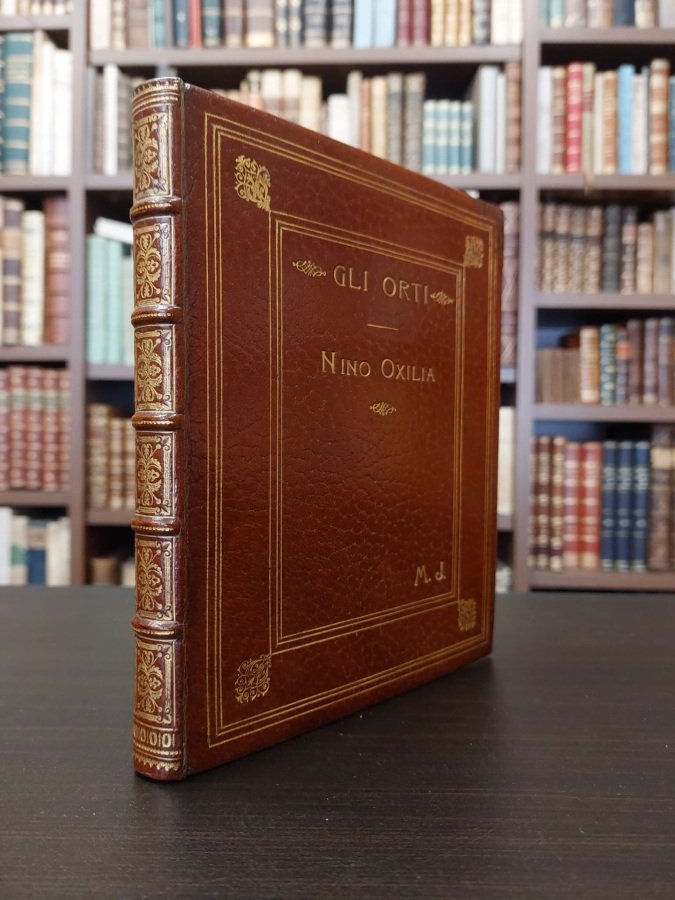 <span style="font-style: normal;">In-16° grande (cm. 18,8), legatura coeva di dedica in pieno marocchino a grana grossa con decorazione in oro </span><i>à la Du Seuil</i>, titolo dell'opera e iniziali della nobile e bellissima attrice romana Maria Jacobini al comparto centrale (restauro a un angolo); taglio superiore dorato; conservata la brossura editoriale illustrata. Edizione originale di pp. XII 127 in ottimo stato (sporadiche fioriture), 1 tavola di ritratto dell'autore fuori testo. Dedica manoscritta al primo foglio bianco da parte degli Ufficiali feriti del palazzo della Regina Madre rivolta all'attrice «cui l'autore dedicò il suo grande affetto mentre offriva alla patria la sua vita preziosa». Nino Oxilia fu anche regista e in più film diresse la Jacobini, a cui si legò sentimentalmente; morì falciato da una granata nella difesa della linea del Monte Grappa. Bell'esemplare d'illustre provenienza custodito in astuccio moderno internamente felpato. [L]