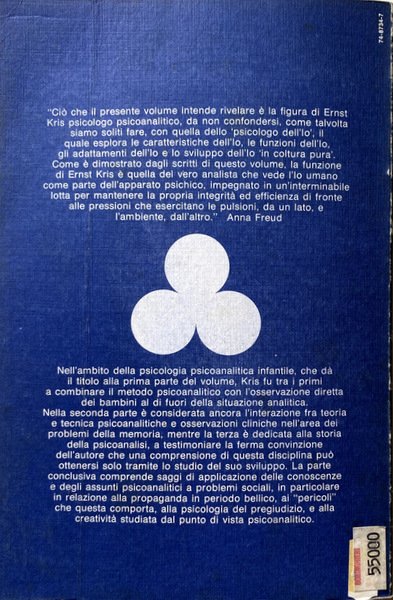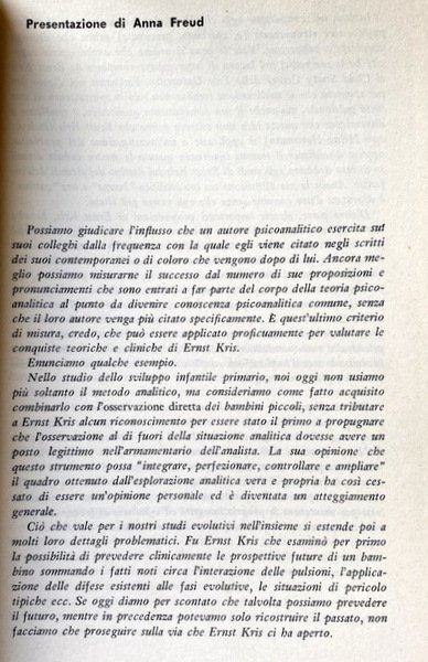 "Ciò che il presente volume intende rivelare è la figura di Ernst Kris psicologo psicoanalitico, da non confondersi, come talvolta siamo soliti fare, con quella dello 'psicologo dell'Io', il quale esplora le caratteristiche dell'Io, le funzioni dell'Io, gli adattamenti dell'Io e lo sviluppo dell'Io 'in coltura pura'. Come è dimostrato dagli scritti di questo volume, la funzione di Ernst Kris è quella del vero analista che vede l'Io umano come parte dell'apparato psichico, impegnato in un'interminabile lotta per mantenere la propria integrità ed efficienza di fronte alle pressioni che esercitano le pulsioni, da un lato, e l'ambiente, dall'altro." Anna Freud