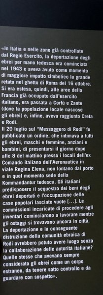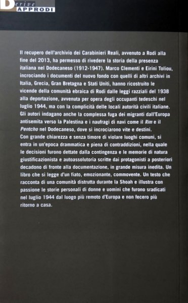 Il recupero dell'archivio dei Carabinieri Reali, avvenuto a Rodi alla fine del 2013, ha permesso di rivedere la storia della presenza italiana nel Dodecaneso (1912-1947). Marco Clementi e Eirini Toliou, incrociando i documenti del nuovo fondo con quelli di altri archivi in Italia, Grecia, Gran Bretagna e Stati Uniti, hanno ricostruito le vicende della comunità ebraica di Rodi dalle leggi razziali del 1938 alla deportazione, avvenuta per opera degli occupanti tedeschi nel luglio 1944, ma con la complicità delle locali autorità civili italiane. Gli autori indagano anche la complessa fuga dei migranti dall'Europa antisemita verso la Palestina e i naufragi di navi come il Rim e il Pentcho nel Dodecaneso, dove si incrociarono vite e destini. Con grande chiarezza e senza timore di violare luoghi comuni, si entra in un'epoca drammatica e piena di contraddizioni, nella quale le decisioni furono dettate dalla contingenza e le memorie di natura giustificazionista e auto-assolutoria scritte dai protagonisti a posteriori decadono di fronte alla documentazione, in grande misura inedita. Un testo che racconta di una comunità distrutta durante la Shoah e illustra con passione le storie personali di donne e uomini che furono sradicati nel luglio 1944 dal luogo più remoto d'Europa e non fecero più ritorno a casa.