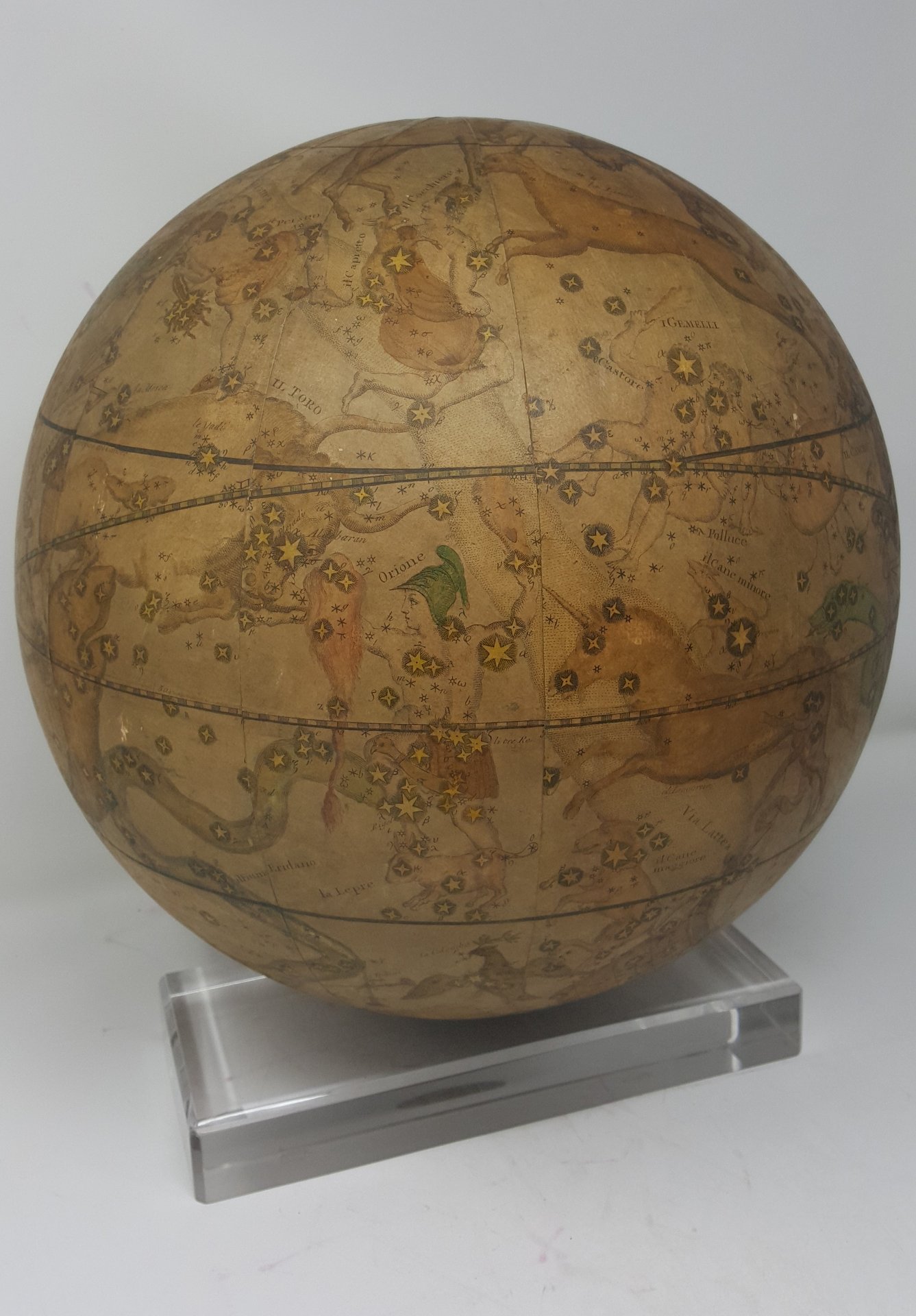 >Due mappamondi - GLOBO TERRESTRE e GLOBO CELESTE - ciascuno consistente di dodici fusi di 30 gradi di ampiezza, ritagliati e incollati su di una sfera di legno e cartapesta del diametro di 35 cm, coloritura di mano coeva.