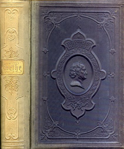 In-8° grande, pp. 1237, (3), legatura editoriale t. tela con ritratto di Goethe in medaglione impresso a secco a sbalzo al centro del piatto anteriore entro ricche bordure e fregi a secco, anch'essi a rilievo. Titolo in oro e fregi in oro e a secco al dorso. Tagli marmorizzati. Una firma di possesso in data 1872. Testo bicolonne in caratteri gotici entro duplice filetto. Ottimo stato. Edizione in un unico volume delle opere principali in versi e in prosa del massimo scrittore tedesco.