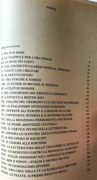 Soggetti: Storia contemporanea, Politica, Comunismo, URSS, Guerra Fredda, Unione Sovietica, Svolta, Krasnodar, Relazioni Internazionali, USA, Crollo, Stalin, Kremlino, Potere, Dissenso, Russia, Regime sovietico, Politica estera, Diplomazia, Totalitarismo, Ideologie politiche, Comunisti, PCI, Palmiro Togliatti, Destalinizzazione, KGB, Servizi Segreti, Polizia, Processi politici, Stato, Nomenklatura, Corruzione, Ligaciov, Stati Uniti, Arnot, MacLaren, Ramzy, Gromyko, Nazional-bolscevismo, Bucharin, Gulag, Purghe, Cina, NEP, Lenin, Praga, Gheddafi, Chernobyl, Letteratura, Intellettuali, Solzenycin, Dudintsev, Rybakov, Bek, Popov, Cinema russo, Cultura, Chrusciov, XX Congresso, Cernenko, Anni ottanta, Settanta, Gorbacev, Mihail Sergeevic, Pravda, Geopolitica, Consenso, Trasparenza, Crollo, Eventi storici, Caduta, Regimi, Dittature, Opposizione, Competizione, Armi nucleari, Vita privata, Biografie storiche, Uomini di potere, Cuba, Crisi dei missili, Fidel Castro, Paesi non allineati, Kruschev, Solženicyn, Internazionale, Giornalismo, Reportage, Inviati, Patate, Alcolismo, Dossier, Congressi, Zinoviev, Zdanov, Mandelstam, Medvedev, Molotov, Mussolini, Nabokov, Romanov, Reagan, Pasternak, Rizhkov, Yakovlev, Trotskij, Ustinov, Sacharov, Suslov, Evtushenko, Chebrikov, Gramsci, Gorbaciova, Eltsyn, Gromyko, Esenin, Marxismo, Marx, Engels, Kamenev, Kirov, Nilde Iotti, Berlinguer, Beria, Achmatova, Andropov, Breznev, Sachalin, Militari, Golpe, Colpo di Stato, Alexandr Bek, Eltsin, Saggistica, Libri Vintage Fuori catalogo, Collezionismo, Riferimento, Bibliografia, Anni Ottanta, Contemporary history, Politics, Communism, Cold War, Soviet Union, Breakthrough, International relations, Collapse, Kremlin, Power, Dissent, Soviet regime, Foreign policy, Diplomacy, Totalitarianism, Political ideologies, Communists, Destalinization, Secret services, Police, Political processes, State, Corruption, United States, National Bolshevism, Purges, China, Prague, Literature, Intellectuals, Russian cinema, Culture, Khrushchev, XX Congress, Eighties, Seventies, Geopolitics, Consent, Transparency, Collapse, Historical events, Fall, Regimes, Dictatorships, Opposition, Competition, Nuclear weapons, Private life, Historical biographies, Men of power, Missile crisis, Non-aligned countries, International, Journalism, Envoys, Potatoes, Alcoholism, Congresses, Military, Coup, Non-fiction, Out of print books, Collectibles, Reference, Bibliography, Eighties