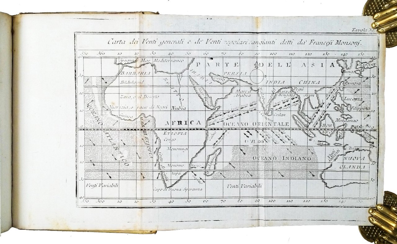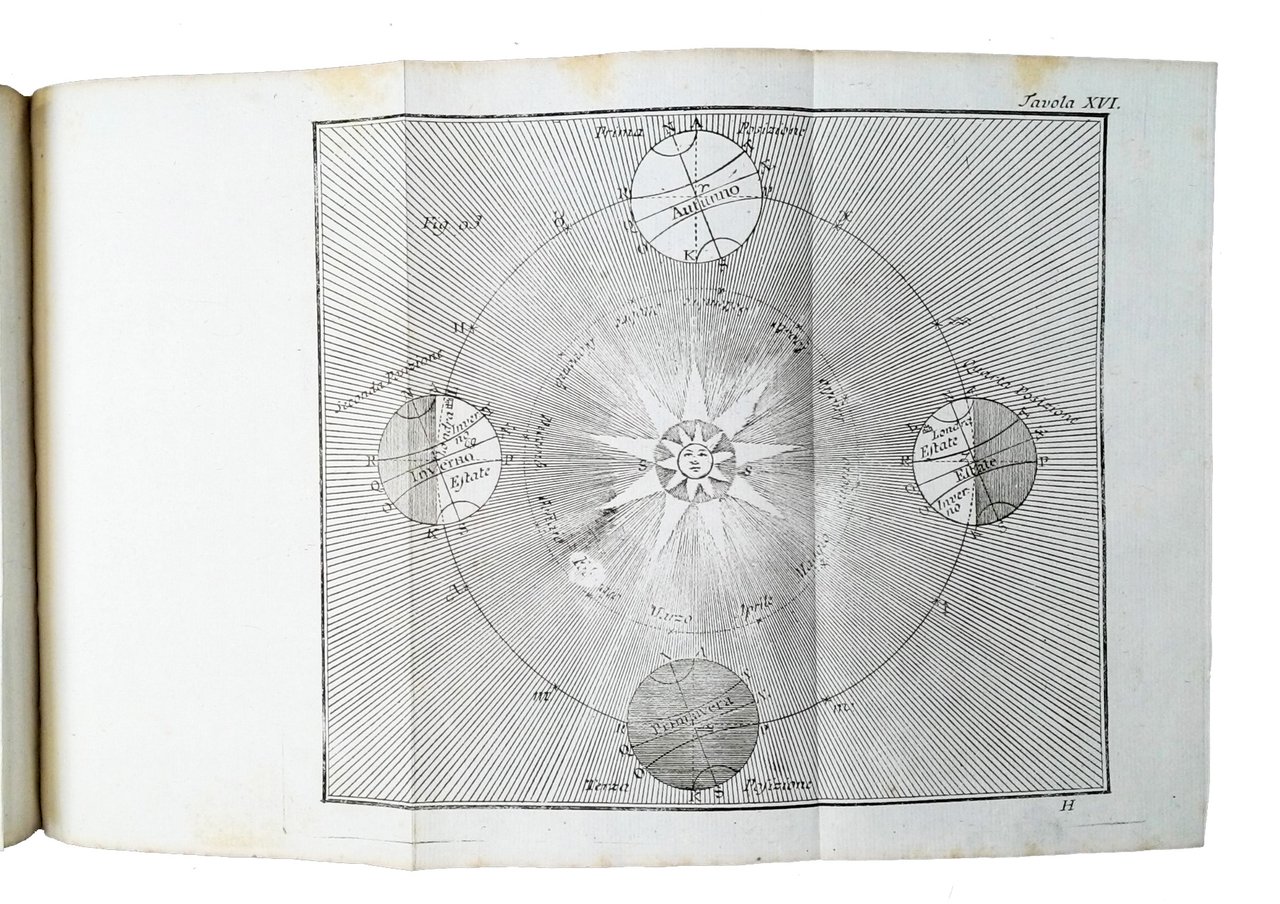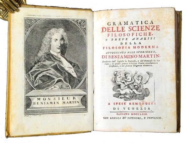 in-8° (182x120 mm); leg. in piena pergamena con titolo in oro su tassello in pelle marrone al dorso; pp. (8), 326; incisione di Francesco Cattini all'antiporta raffigurante l'autore, frontespizio stampato in rosso e nero con vignetta calcografica, 24 tav. in b/n più volte ripiegate di cui 22 in fondo al testo, preziose testatine, capilettera e finalini xilografati. Quarta ed. veneta di questo interessante testo scientifico in cui si affrontano temi di fisica, astronomia, meteorografia, teoria dei draghi volanti, chimica e geologia. Opera tradotta dall'inglese in francese, e dal francese in italiano. La prima edizione inglese, The philosophical grammar, fu pubblicata nel 1735. Benjamin Martin (1704 - 1782) fu un matematico, lessicografo e costruttore di strumenti scientifici, divulgatore del pensiero di Newton. Rif.: IT\ICCU\VIAE\006168. OCLC, 24126203 (5 copie in USA e 1 in Slovenia). Cond.: Opera completa in perfette condizioni. -- FOURTH VENETIAN EDITION OF AN INTERESTING SCIENTIFIC TEXT, DEALING WITH ISSUES OF PHYSICS, ASTRONOMY, METEOROLOGY, THE THEORY OF FLYING DRAGONS, CHEMISTRY AND GEOLOGY. Complete work, in perfect condition.