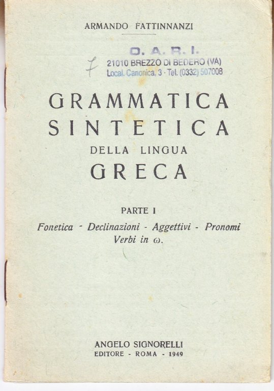 Grammatica sintetica della lingua greca. Parte I: Fonetica - Declinazioni - Aggettivi - Pronomi - Verbi in ?