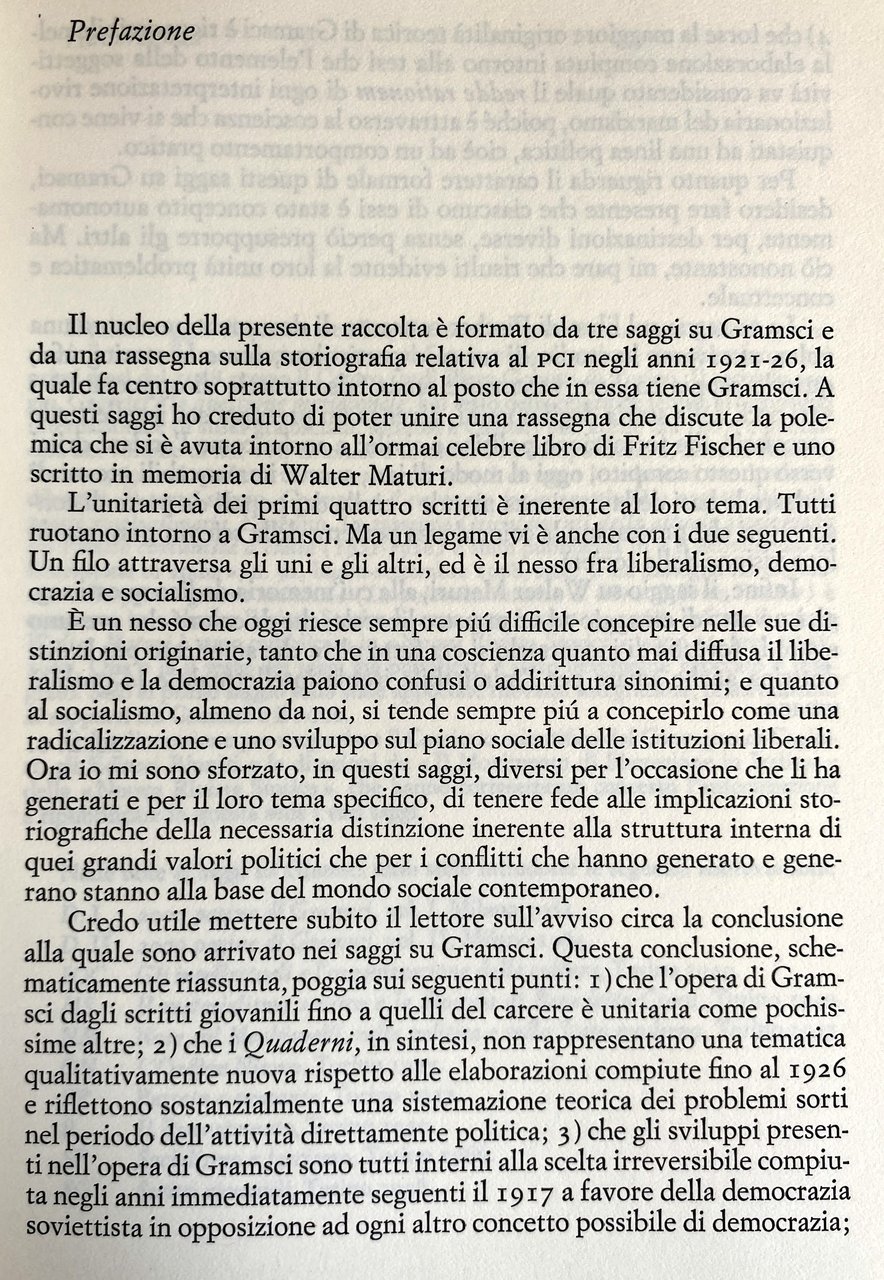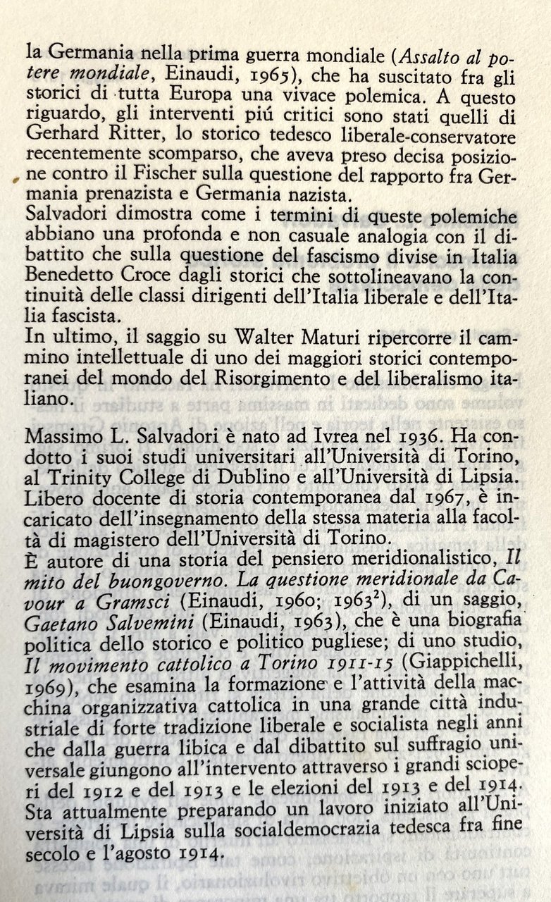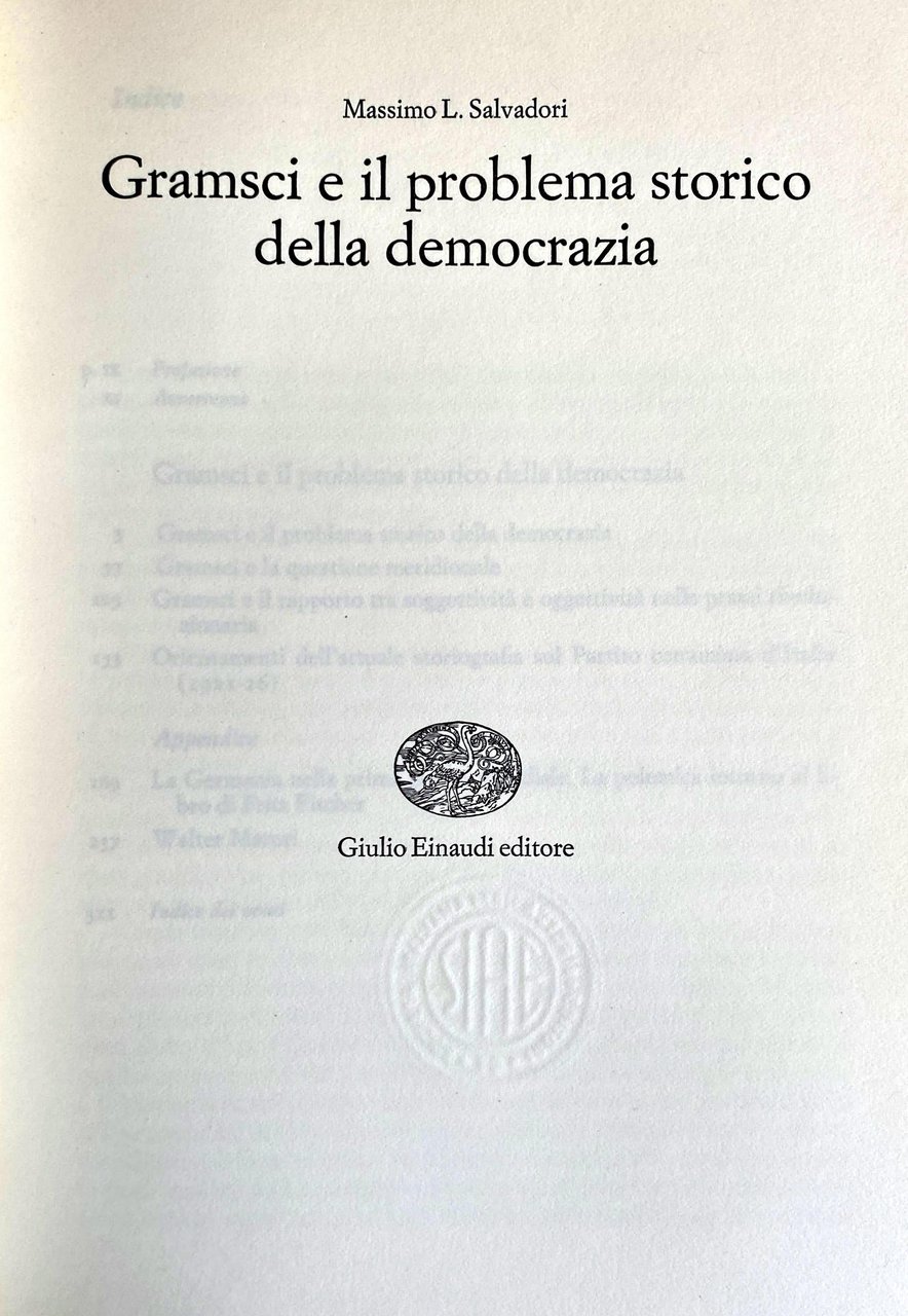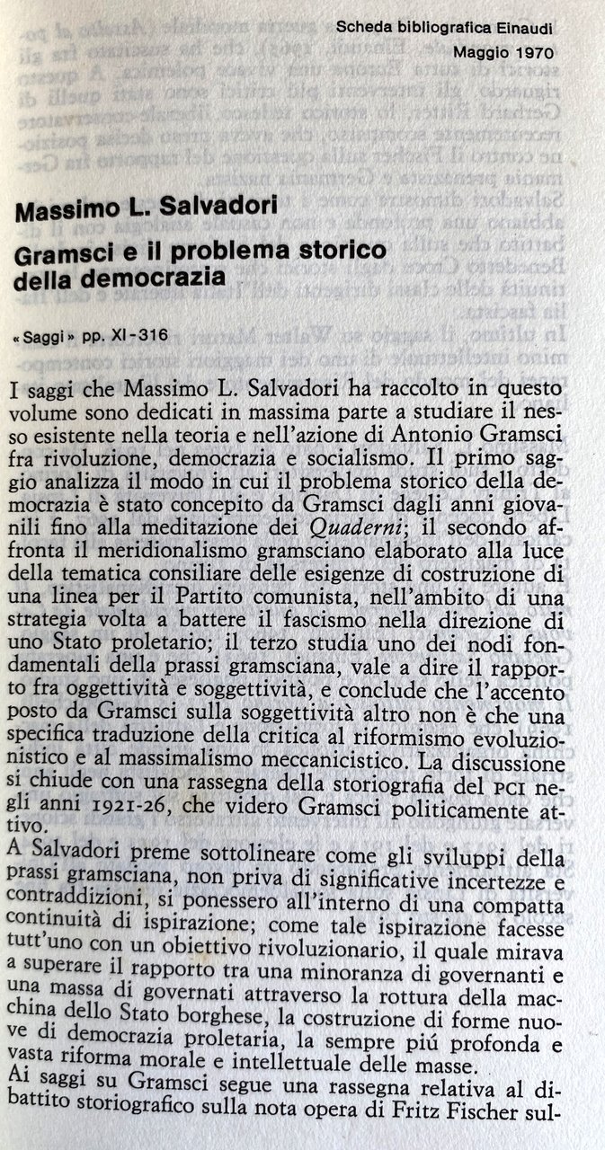 I saggi che Massimo L. Salvadori ha raccolto in questo volume sono dedicati in massima parte a studiare il nesso esistente nella teoria e nell'azione di Antonio Gramsci fra rivoluzione, democrazia e socialismo. Il primo saggio analizza il modo in cui il problema storico della democrazia è stato concepito da Gramsci dagli anni giovanili fino alla meditazione dei Quaderni; il secondo affronta il meridionalismo gramsciano elaborato alla luce della tematica consiliare delle esigenze di costruzione di una linea per il Partito comunista, nell'ambito di una strategia volta a battere il fascismo nella direzione di uno Stato proletario; il terzo studia uno dei nodi fondamentali della prassi gramsciana, vale a dire il rapporto fra oggettività e soggettività, e conclude che l'accento posto da Gramsci sulla soggettività altro non è che una specifica traduzione della critica al riformismo evoluzionistico e al massimalismo meccanicistico. La discussione si chiude con una rassegna della storiografia del PCI negli anni 1921-26, che videro Gramsci politicamente attivo. A Salvadori preme sottolineare come gli sviluppi della prassi gramsciana, non priva di significative incertezze e contraddizioni, si ponessero all'interno di una compatta continuità di ispirazione; come tale ispirazione facesse tutt'uno con un obiettivo rivoluzionario, il quale mirava a superare il rapporto tra una minoranza di governanti e una massa di governati attraverso la rottura della macchina dello Stato borghese, la costruzione di forme nuove di democrazia proletaria, la sempre più profonda e vasta riforma morale e intellettuale delle masse. Ai saggi su Gramsci segue una rassegna relativa al dibattito storiografico sulla nota opera di Fritz Fischer sulla Germania nella prima guerra mondiale (Assalto al potere mondiale), che ha suscitato fra gli storici di tutta Europa una vivace polemica. A questo riguardo, gli interventi più critici sono stati quelli di Gerhard Ritter, lo storico tedesco liberale-conservatore recentemente scomparso, che aveva preso decisa posizione contro il Fischer sulla questione del rapporto fra Germania prenazista e Germania nazista. Salvadori dimostra come i termini di queste polemiche abbiano una profonda e non casuale analogia con il dibattito che sulla questione del fascismo divise in Italia Benedetto Croce dagli storici che sottolineavano la continuità delle classi dirigenti dell'Italia liberale e dell'Italia fascista. In ultimo, il saggio su Walter Maturi ripercorre il cammino intellettuale di uno dei maggiori storici contemporanei del mondo del Risorgimento e del liberalismo italiano.