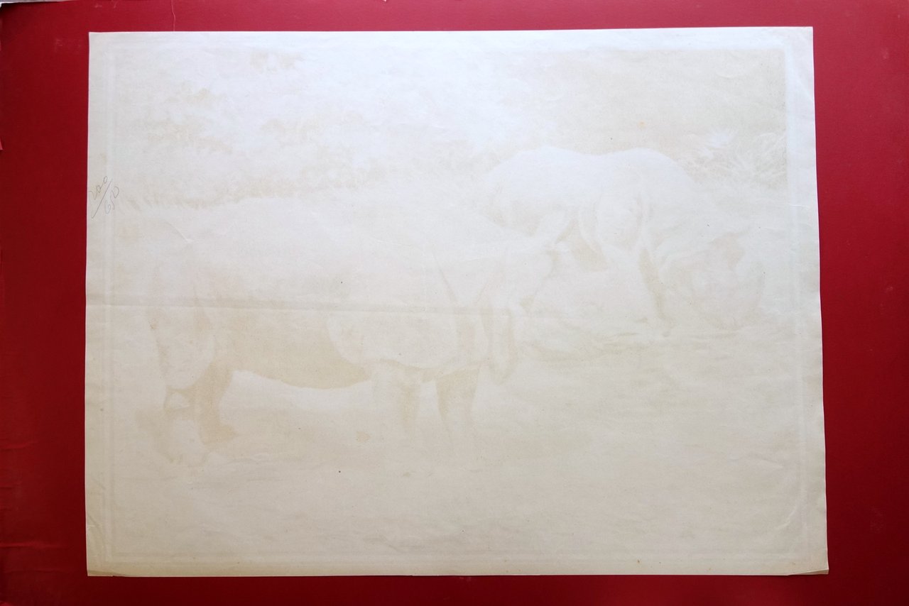 Grande tavola cromolitografica, Rhinoceros Unicornis" (Rinoceronte) - Morfologia animale A. Vallardi - Milano, s. d. (primo '900); grande bella tavola cromolitografica su carta; retro bianco. Cm 70x93. Condizioni di conservazione Esemplare in buono stato con minimi segni del tempo, lievemente rifilato ai margini; tre angoli con lievi tracce di pieghette; qualche pressoché trascurabile brunitura; margine sup. con pochi lievi graffietti. XXL.019 N "