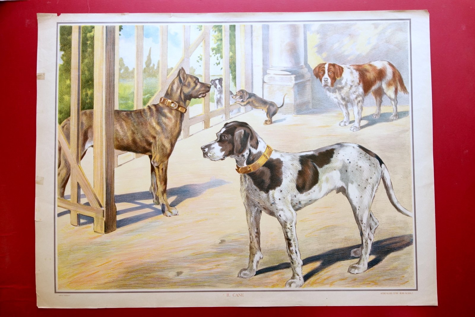 Grande tavola cromolitografica, Animali domestici Il cane - F. Matteotti dipinse Vallardi, Milano, s. d. (primi anni del '900); grande tavola cromolitografica su carta spessa; illustrazione di F. Matteotti. Retro bianco. Cm 71x95,5. Condizioni di conservazione Esemplare complessivamente in buono stato con qualche piccolo / minimo strappetto ai margini; al margine sup. strappetto di alcuni cm restaurato al retro mediante nastro per riparazioni cartacee (vedi foto); due piccoli strappetti a un margine esterno anch'essi restaurati al retro (vedi foto); angolo superiore destro con una minuscola mancanza. Minime bruniture principalmente al retro. XXL.024 N