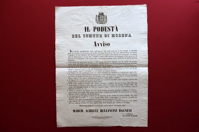 Grida Comune di Modena Visita Papa Pio IX Disposizioni Percorsi Carrozze 1857