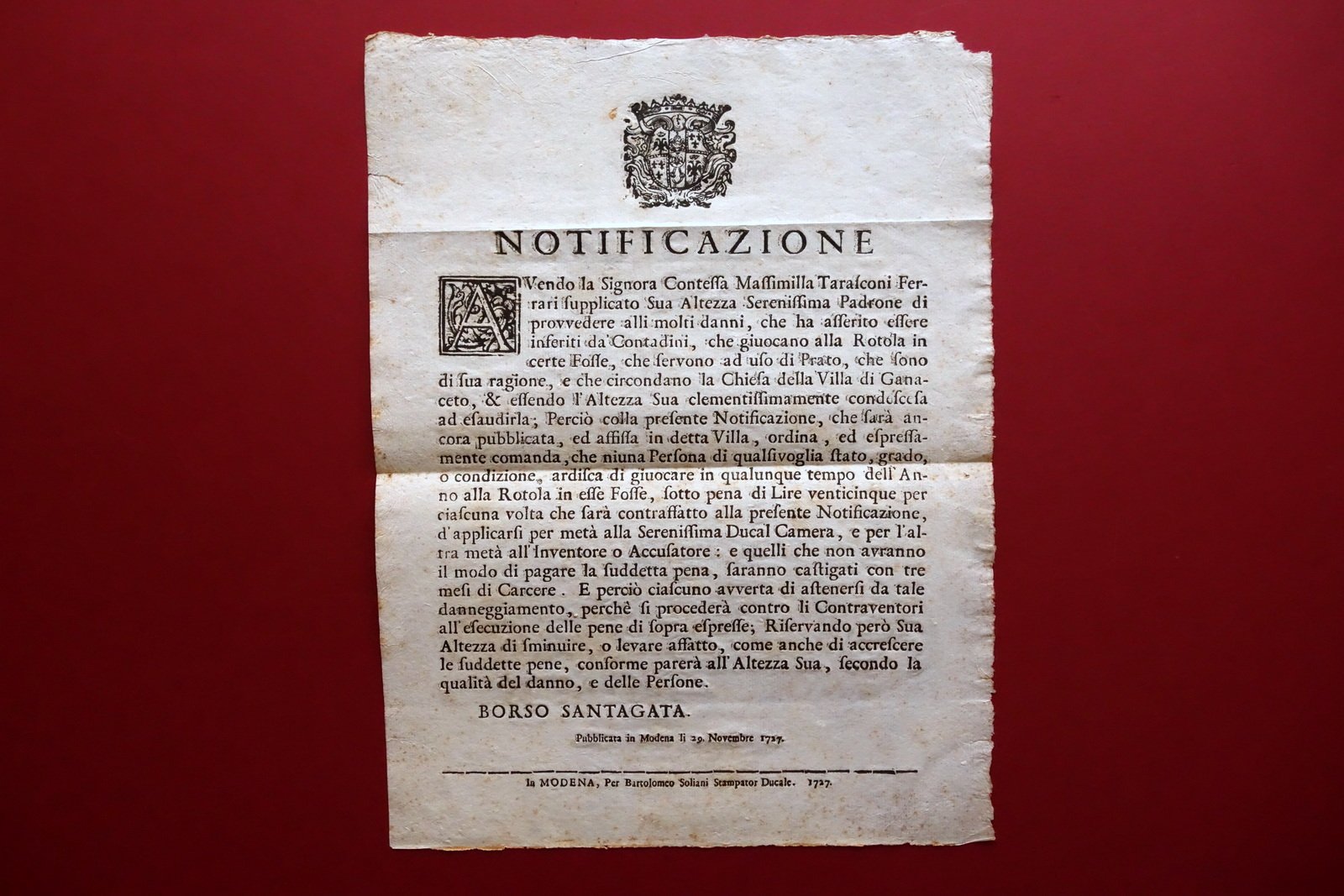 Notificazione, Notificazione Avendo la Signora Contessa Massimilla Tarasconi Ferrari supplicato Sua Altezza Serenissima Padrone di provvedere alli molti danni, che ha asserito essere inferiti da'Contadini, che giuocano alla Rotola in certe Fosse, che servono ad uso di Prato, che sono di sua ragione, e che circondano la Chiesa della Villa di Ganaceto [.]" Per Bartolomeo Soliani, Modena 1727; bel capolettera e stemma Estense xilografici. Margini alla forma. Cm 40,5x31. Condizioni di conservazione Buone condizioni con tracce di pieghe per conservazione, piccole lievi / leggere bruniture, margine sinistro lievemente rifilato; angolo sup. destro con una minima mancanza. Molto rara. SC03.D19567 N "
