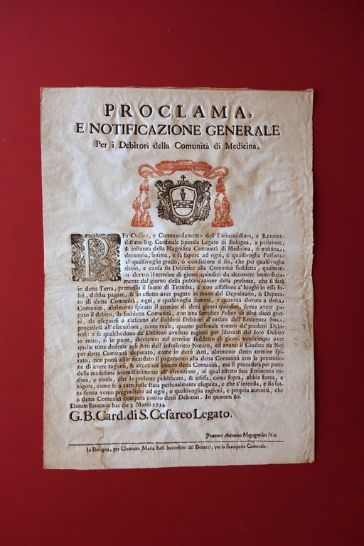 Grida Proclama Debitori della Comunit‡ di Medicina Bologna Debiti Spinola 1734