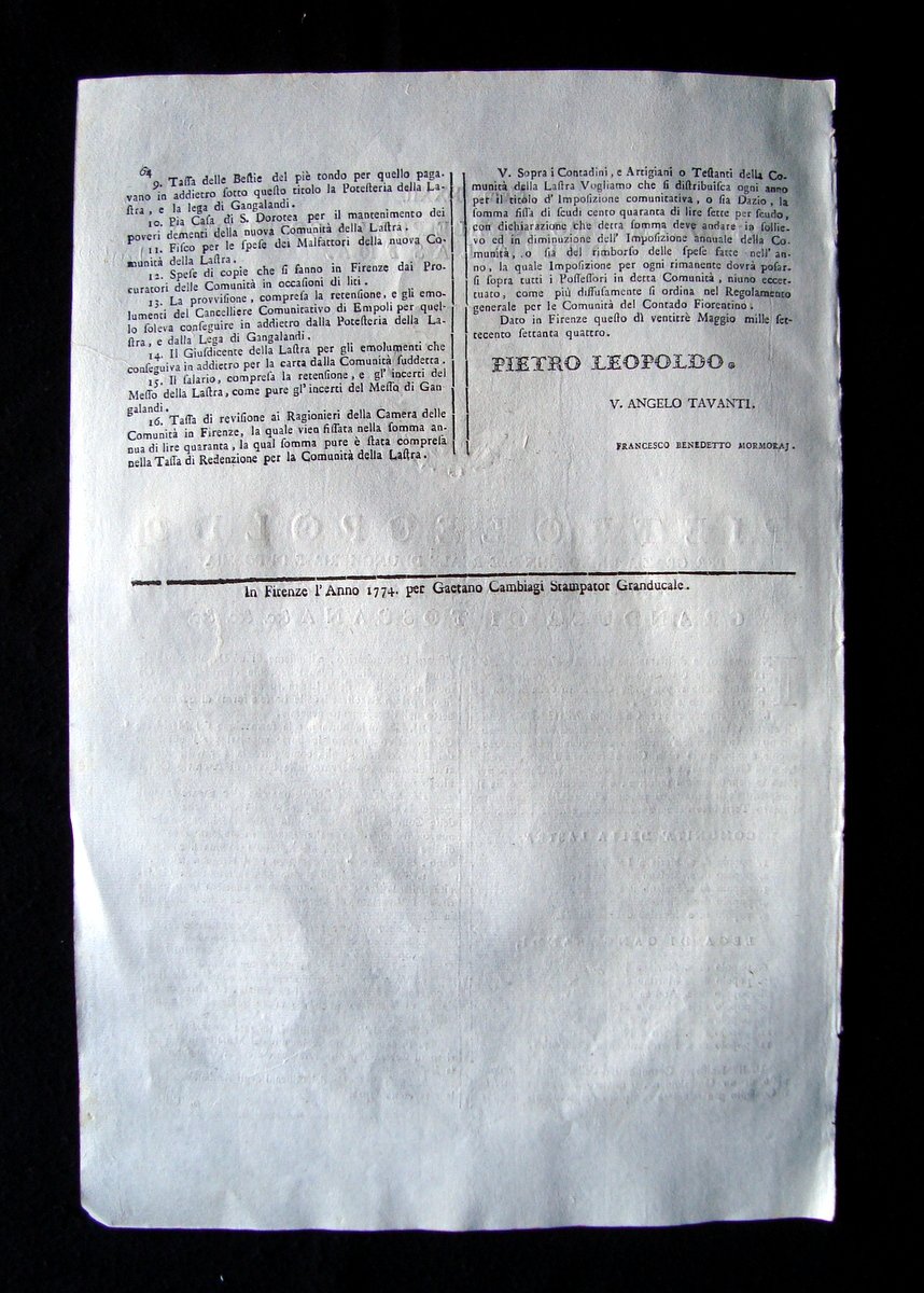 Num.XXXII Regolamento locale per la comunità della Lastra Pietro Leopoldo per grazia di Dio . Granduca di Toscana Gaetano Cambiagi Stampator Granducale, Firenze 1774; cm.40,5 x 27 cm, 1 foglio fronte/retro originale e completo, bel fregio xilografico in prima pagina, testo su due colonne. Condizioni di conservazione Esemplare in ottimo stato di conservazione con leggere tracce del tempo. Tracce di antica fascicolazione sul dorso. SC03.D16512 F blu
