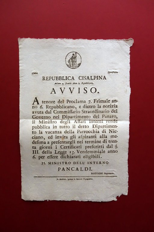 Grida, Repubblica Cisalpina Avviso A tenore del Proclama 7 Frimale anno 6 Repubblicano [.] il Ministro degli Affari interni rende pubblica in tutto il detto Dipartimento la vacanza della Parrocchia di Nicciano [.]" Presso la Società Tipografica, Modena 1799; margini alla forma; piccolo fregio cisalpino inciso alla parte superiore. Cm 32x22. Condizioni di conservazione Condizioni più che buone con minimi segni del tempo, normali pieghe di conservazione, qualche minima leggera brunitura, una minima mancanza all'angolo inferiore destro. SC03.D19321 N "