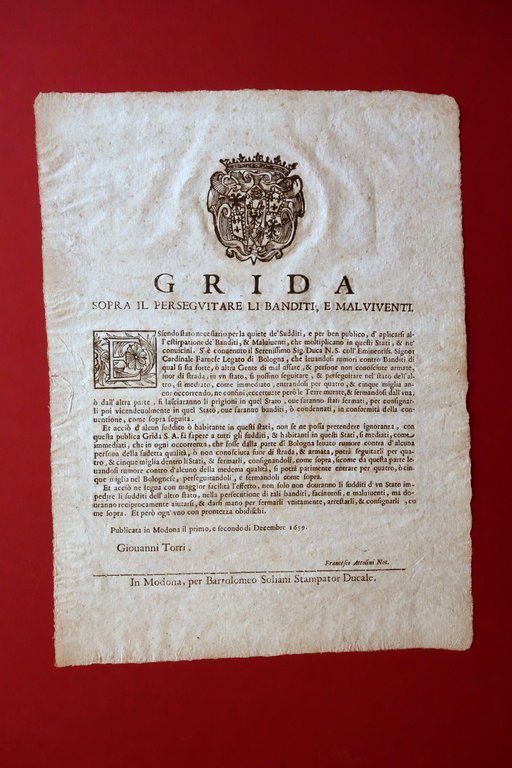 Grida, Grida sopra il perseguitare li banditi, e malviventi Essendo stato necessario per la quiete de'Sudditi, e per ben publico, d'aplicarsi all'estirpatione de'Banditi, et Malviventi, che moltiplicano in questi Stati, et ne' convicini, s'è convenuto il Serenissimo Sig. Duca N. S. coll'Eminentissimo Signor Cardinale Farnese Legato di Bologna, che levandosi rumori contro Banditi di qual si sia sorte, o altra Gente di mal affare, et persone non conosciute armate [.]" Per Bartolomeo Soliani Stampator Ducale, Modena 1659; bel capolettera e stemma xilografici; margini alla forma. Cm 38x28,5. Condizioni di conservazione Buone condizioni con leggeri segni del tempo, normale minima traccia di piega di conservazione, minimo ingiallimento e alcune piccole leggere bruniture. Per ulteriori dettagli vedi foto. Molto interessante, nella quale si parla di un accordo col Legato di Bologna il Cardinale Farnese per la persecuzione dei banditi e facinorosi lungo il confine tra i due stati, con permesso di sconfinare per brevi tratti. Norme, regole e disposizioni per gli interventi atti a garantire la sicurezza. SETT199.L25608 N "
