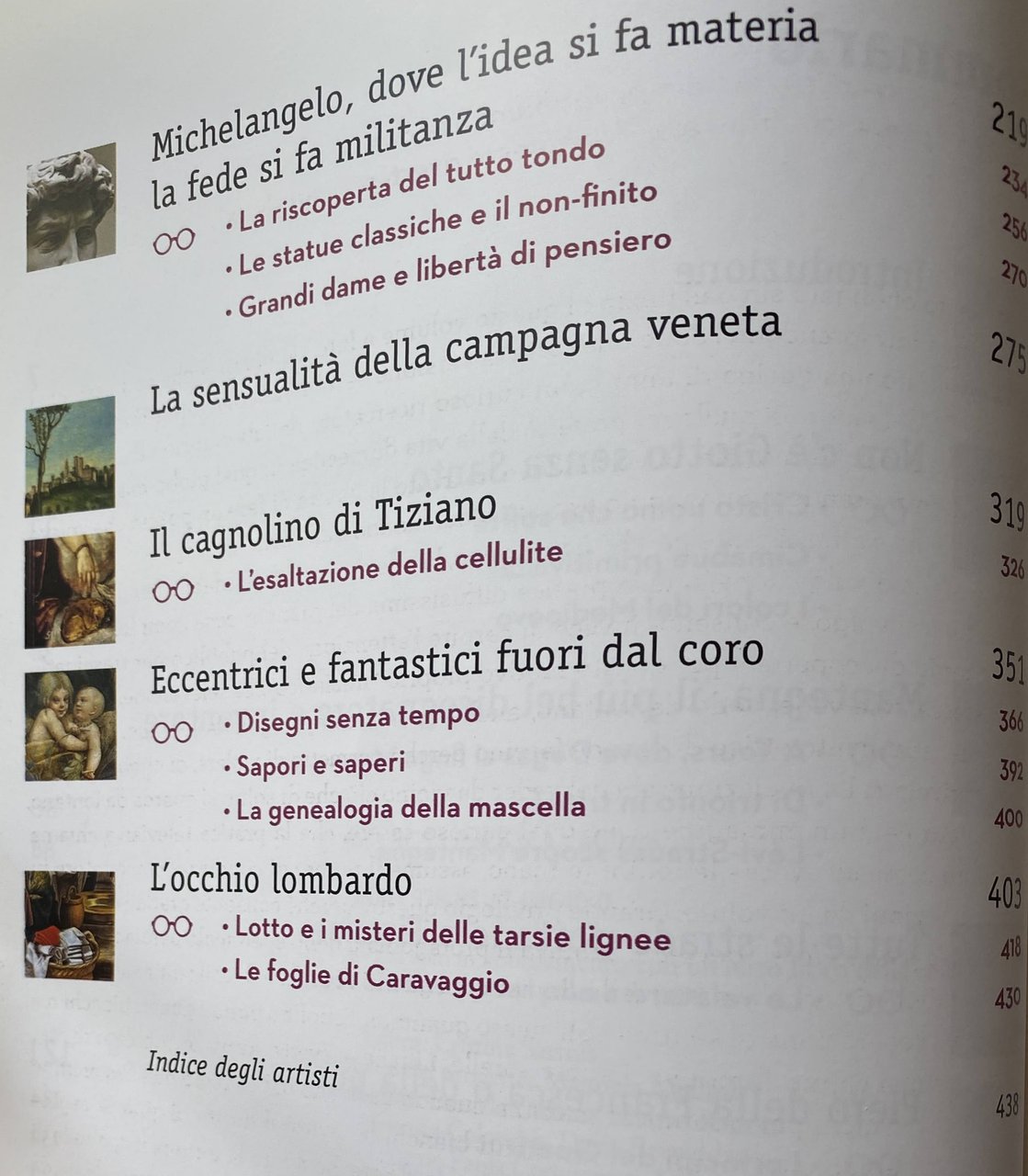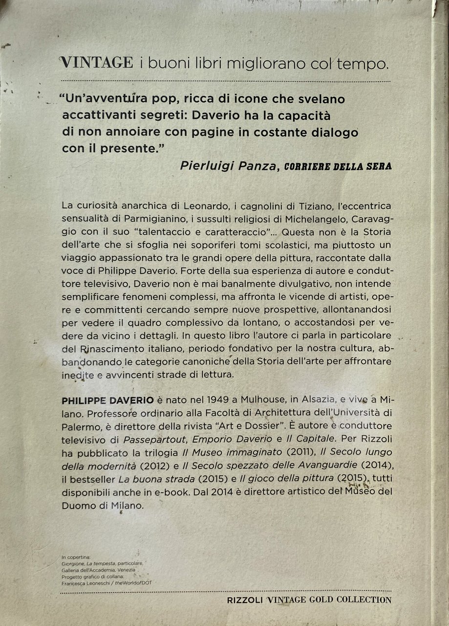 La curiosità anarchica di Leonardo, i cagnolini di Tiziano, l'eccentrica sensualità di Parmigianino, i sussulti religiosi di Michelangelo, Caravaggio con il suo "talentaccio e caratteraccio". Questa non è la Storia dell'arte che si sfoglia nei soporiferi tomi scolastici, ma piuttosto un viaggio appassionato esoterico tra le grandi opere della pittura, raccontate dalla voce di Philippe Daverio. Forte della sua esperienza di autore e conduttore televisivo, Daverio non è mai banalmente divulgativo, non intende: semplificare fenomeni complessi, ma affronta le vicende di artisti, opere e committenti cercando sempre nuove prospettive, allontanandosi per vedere il quadro complessivo da lontano, o accostandosi per vedere da vicino i dettagli. In questo libro l'autore ci parla in particolare del Rinascimento italiano, periodo fondativo della cultura e dell'arte italiana acquista così nuova freschezza e vivacità, prende le mosse dalla pittura di Giotto, "un fulmine nella storia dell'arte", attraversando la curiosità anarchica di Leonardo, i cagnolini di Tiziano, l'eccentrica sensualità di Parmigianino e i sussulti religiosi di Michelangelo. L'allontanamento dalle categorie canoniche della storia dell'arte e la pratica dello spostamento del punto di vista si rivelano in particolare nelle Daveriologie, pagine nelle quali la curiosità impertinente dell'autore affronta nuove strade di lettura, attraverso accostamenti insoliti di capolavori e artisti lontani nel tempo e nello spazio.