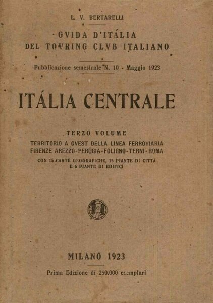 Guida dell'Italia Centrale, terzo volume: territorio a Ovest della linea ferroviaria Firenze-Arezzo-Perugia-Foligno-Terni-Roma; con 15 carte geografiche, 15 piante di città e 6 piante di edifici.Br.ed., ill., in 16mo, lievi segnature e bruniture ai margini, segnalibri in stoffa.