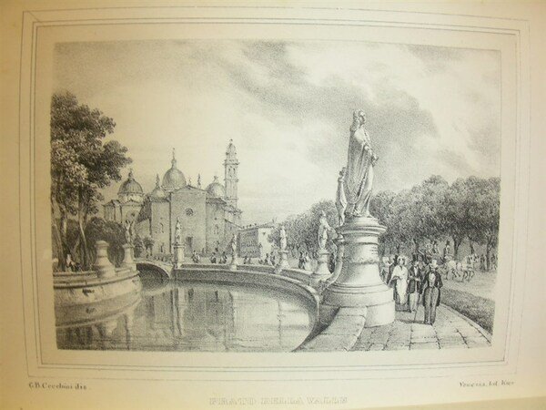 gr. vol. in-8 (mm.220x140), pp. XII, 560, belliss. leg. in velluto color porpora con impressioni a secco ai piatti e al d. Risguardi in seta. Tagli dorati. Con 2 gr. tavv. litogr. (mm. 510x450) di A.B. Bresciani su dis. di L. Patella, più volte ripiegate all'inizio e al fine del volume raff. la pianta topografica della città, con ampia legenda, e la provincia. Con 20 belle tavv. litogr. f.t., protette da veline, inc. da G.B. Cecchini. Rara guida illustrata della città, suddivisa in 6 sezioni: storia; opere artistiche; istituzioni pubbliche; chiese, edifici di culto e monasteri; geologia, idrologia, commercio, agricoltura e industria; località della provincia. Bellini, Storia della Tipografia del Seminario di Padova, p. 228: "L'epoca del maggior lustro à nostri tempi doveva essere l'avventurata del 1842 in cui si unirono in Padova gli Scienziati italiani. Volendo il Padovano Municipio approfittare della Tipografia del Seminario per pubblicare la nuova Guida della Città, trovai necessario di provvederla di torchi e caratteri moderni, dei quali era mancante, per dare un'elegante edizione. Recatomi [.] in Milano feci ricche commissioni di caratteri silvio, filosofia, garamoncino, con molti altri da due righe, e copiosi corredi di fregi alemanni, vignette [.]. Bella e autorevole edizione, opera di diversi eruditi, quali Furlanetto, Selvatico, Cittadella". Lauro, 3508. Buzzanca: "Si tratta della più completa e illustre guida ottocentesca di Padova". Molto rara, edita in soli 1000 esempl. Dif. alla cerniera del piatto ant. parzialm. slegato e scoloritura al d. Ottimo esempl. [079]