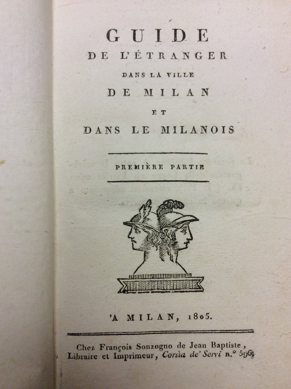 In-8 p. (mm. 205x115), 2 volumi, cartonato moderno, titolo manoscritto su etichetta al dorso, pp. XXVIII,124; 132; con una deliziosa vignetta xilografata ai frontespizi e con 4 tavole fuori testo, più volte ripieg. ed inc. in rame, così composte: una pianta topografica di Milano, una carta dell'Alto Novarese, una della Val Tellina e una mappa del viaggio ai laghi Maggiore, di Lugano e di Como.La prima parte tratta di Milano, la seconda dei dintorni. Cfr. Villa Bibliogr. Guide di Milano, n. 100: L'autore si rifà al Bianconi e segue il suo piano: la città descritta secondo le sei porte principali (Orientale. Romana, porte Marengo ci-devant Ticinese, Vercellina, Comasina, Nuova). Stampata per gli eventuali viaggiatori che dovessero venire a Milano in occasione dell'incoronazione di Napoleone Re d'Italia, la guida dà al viaggiatore un estratto per indicargli ciò che interessa a un artista, a un dilettante e a un curioso. Lieve alone marginale al 1° volume; altrimenti esemplare con barbe, ben conservato.