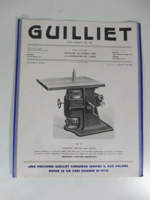 Pieghevole pubblicitario di 8 facciate (ciascuna misura cm 22,5 x 28) con illustrazioni di macchine Guilliet per la lavorazione del legno: fresatrici, piallatrici, incavatrici, seghe a nastro, ecc.