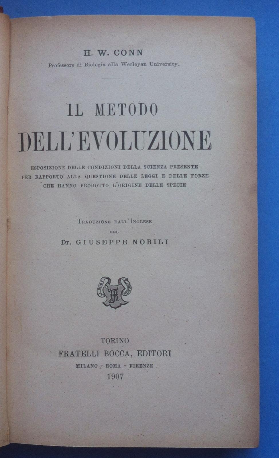 H. W. CONN-IL METODO DELL'EVOLUZIONE-TORINO F.LLI BOCCA 1907†PAG. 360 CM. 20,5 X 12,5 COPERTINA IN TELA RIGIDA MARRONE, DORSO CON CARATTERI IN ORO (VEDERE IMMAGINI), INTERNO IN BUONO STATO, N. PAG. 360 CM. 20,5 X 12,5