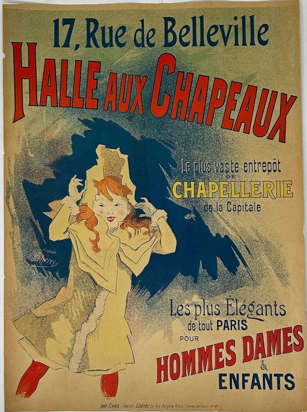 >Manifesto litografico originale (mm. 382x278). Piccola affiche pubblicitaria raffigurante una bambina dai capelli rossi che sfoggia allegramente il suo nuovo cappellino. Alla fine dell'ottocento era di moda indossare un elegante cappello per uscire. Buon esemplare di quest'iconico manifesto di Cheret (abilmente rinforzato al verso, piccola mancanza restaurata di 3mm). Cheret 1064 e 1069, Broido 835.