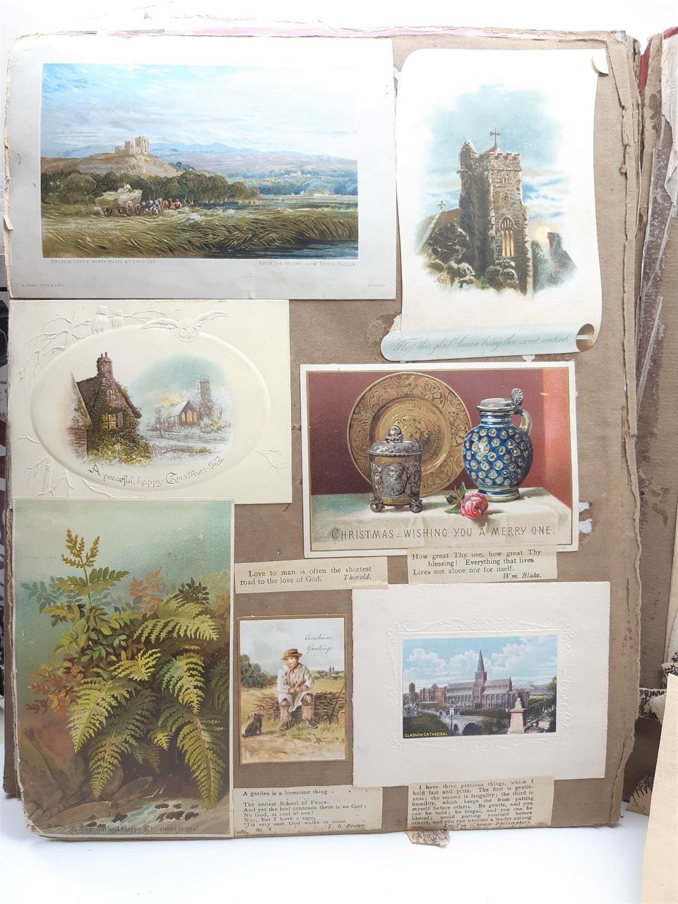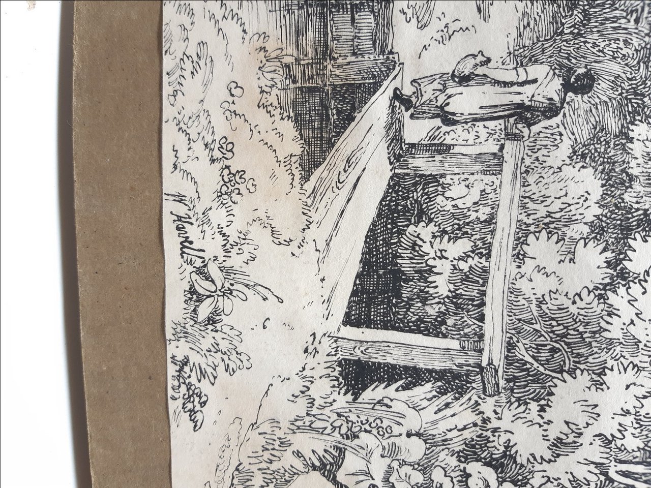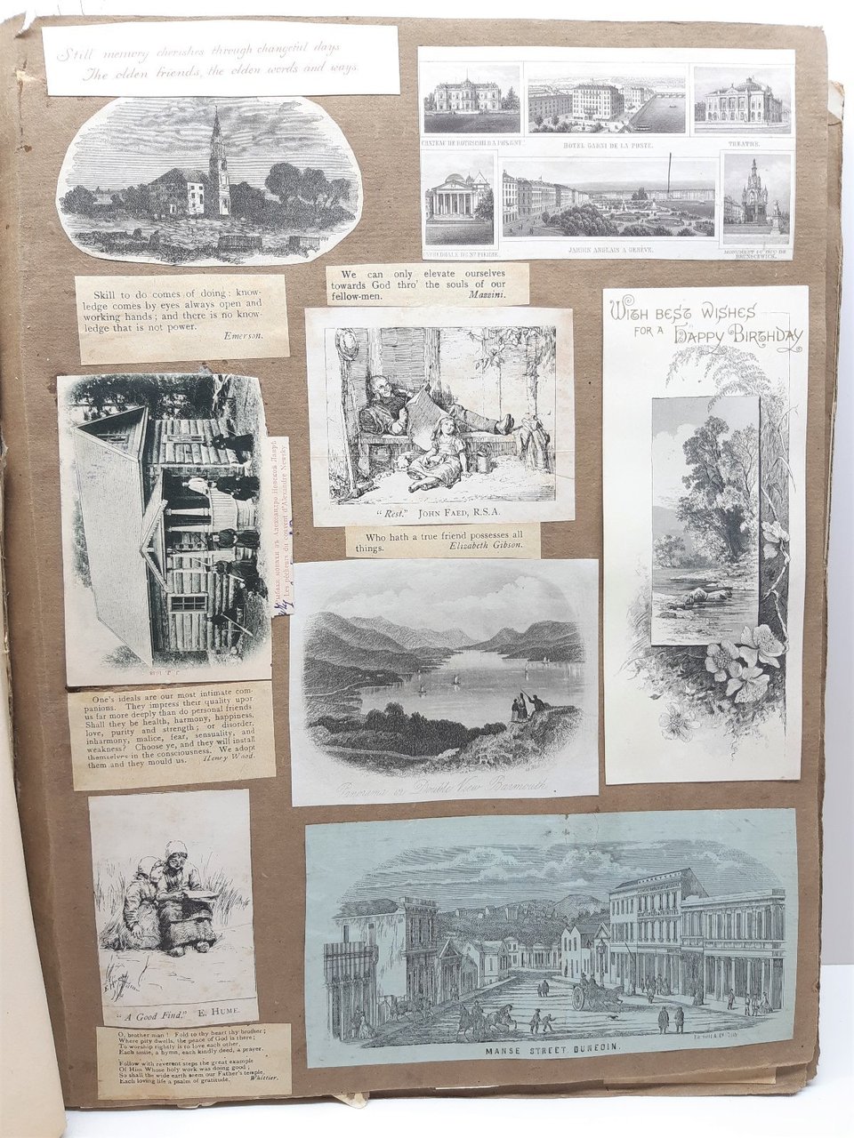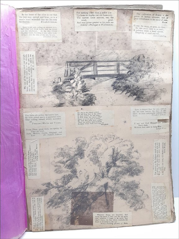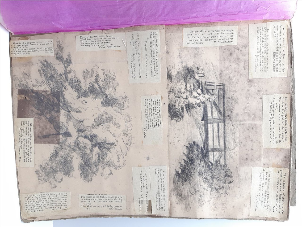 album con 7 disegni originali original drawings) di William Havell 1782-1857 pi˘ due a china da verificare 7 disegni splendidamente eseguiti a matita e due (forse) a china, uno dei due staccati dal foglio. insolito album 1820 circa, di 16 pagine cm. 35 x 27, su cui sono incollate 40 cartoline di auguri sicuramente coeve, alcune riproduzioni fotografiche forse di suoi quadri, numerose incisioni di paesaggi ritagliate e incollate, circa 60 talloncini con citazioni scritte in inglese. legatura marmorizzata rigida, sciupata e con dorso mancante, pagine interne su carta molto pesante parzialmente staccate, su cui sono incollate cartoline e fogli con disegni originali di Havell, nell'album ci sono anche parti di un foglio strappato contenente un terzo disegno a china che non abbiamo conteggiato. si tratta di un album veramente insolito e originale, da studiare, William Havell fu un paesaggista inglese vissuto nella prima met‡ dell'800.