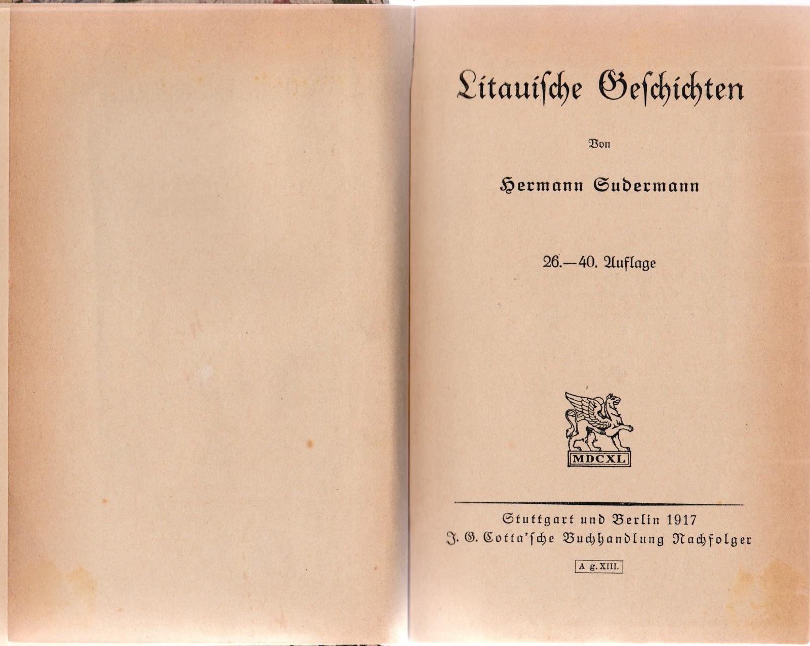 HERMANN SUDERMANN LITAUISCHE GESCHICHTEN STUTTGART UND BERLIN 1917-L4273 COPERTINA RIGIDA IN TELA A FIORI, DORSO LEGGERMENTE BRUNITO CON TASSELLO NERO E TITOLO IN ORO, TAGLI CON LIEVI FIORITURE, IN BUONE CONDIZIONI PAGINE CON ALCUNE FIORITURE, LIEVE BRUNITURA AL MARGINE ESTERNO N. PAG. 465 CM. 18,5 x 12