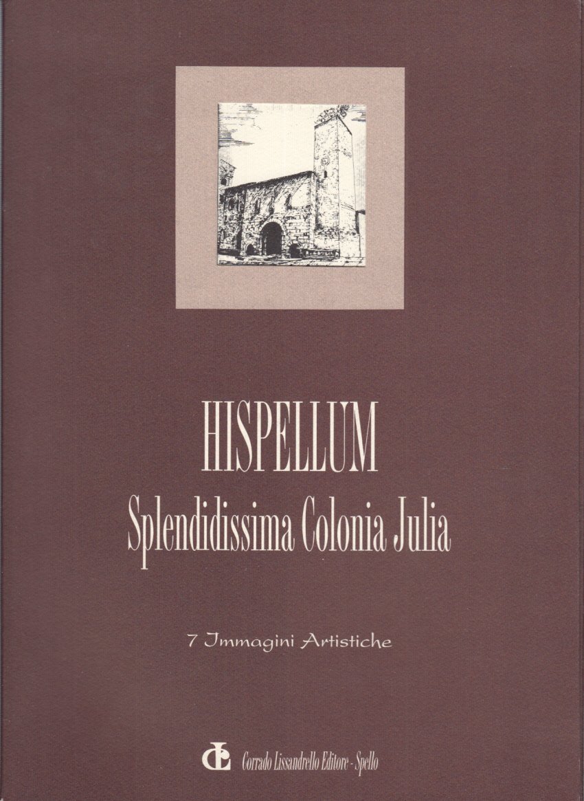 Cartella stampata in tiratura limitata e corredata da una breve presentazione storica, raccoglie 7 stampe eseguite da Corrado Lissandrello raffiguranti alcuni tra i piu' suggestivi scorci di Spello, vestigia di epoche remote perfettamente inserite nel tessuto vitale del paese. Macchiolina parte posteriore cartella. OTTIMO