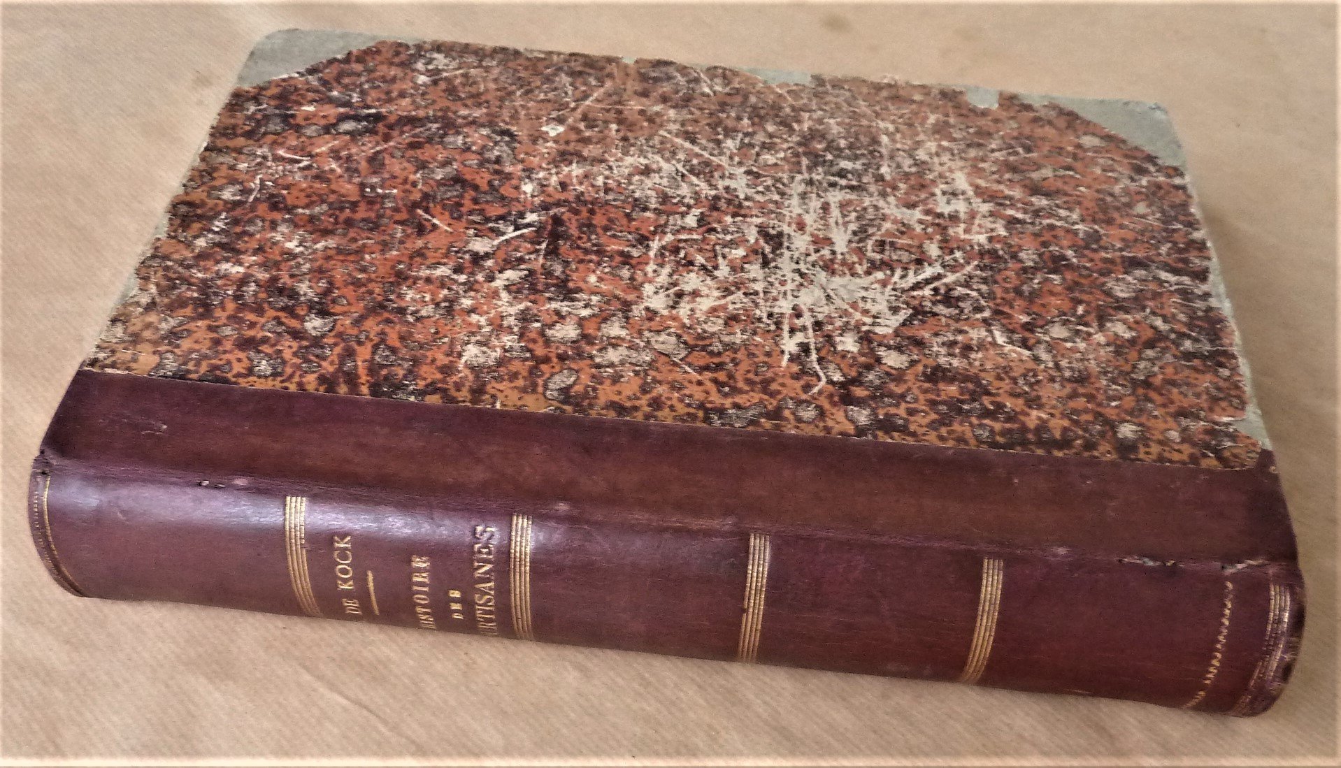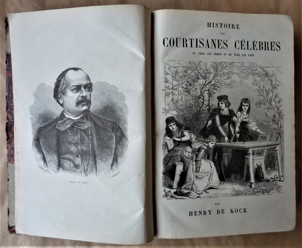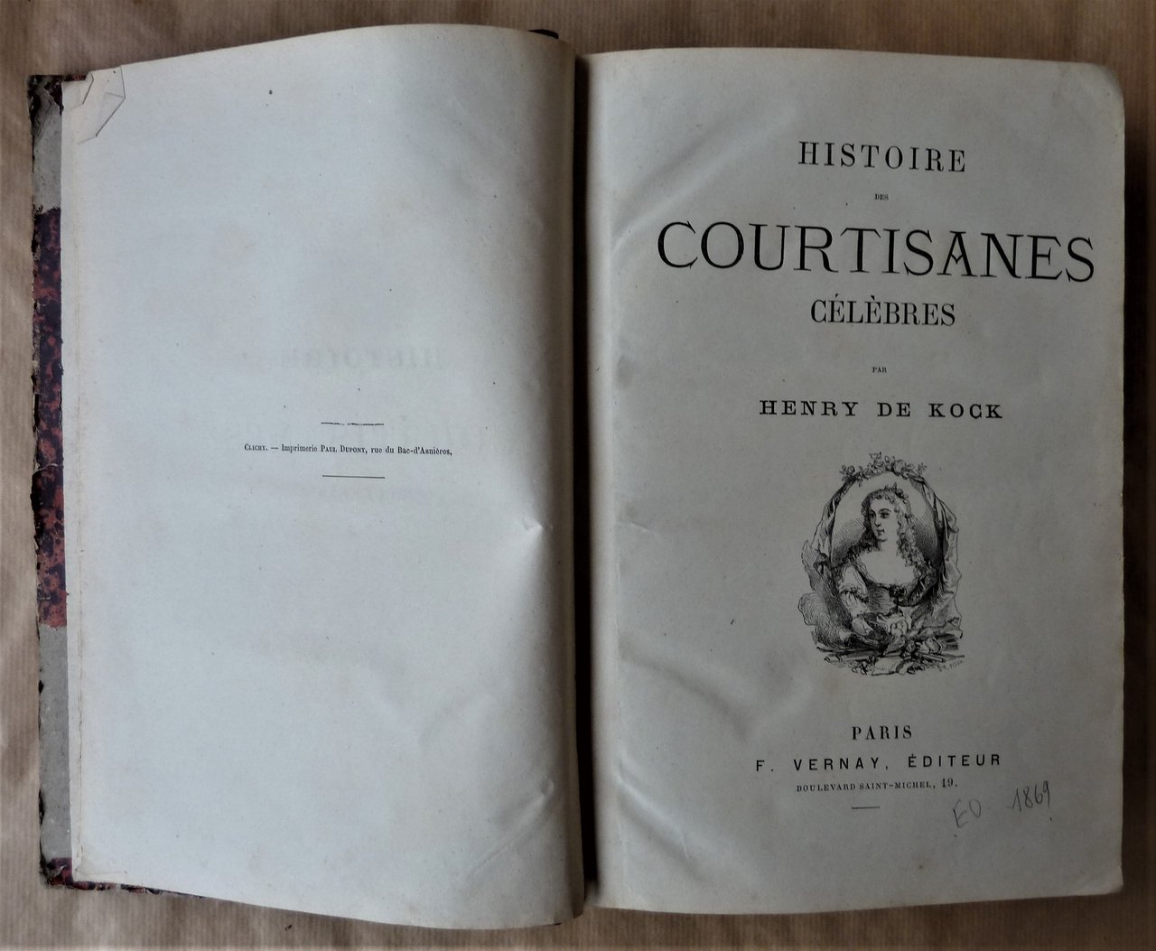 Un très fort volume de format in 8° de 3 ff. (faux titre, titre, frontispice); 796 pp.; 1 feuillet de table. très nombreuses gravures sur bois par Bissoncottard, Valentin, Delangle; Gerlier; Montenier, Godefroy-Durand, Coppin,Ildrau, Pouget-Delaville. Reliure en demi basane brune; dos lisse; titres et filets dorés. Ensemble bien complet des 99 fascicules de cette somme de 32 biographies romancées et coquines sur les Courtisanes Célèbres de l'histoire, par Henry de Kock (le fils de paul. De Kock). Des fentes à quelques pages quelques-unes avec manque sans atteinte au texte. Une page, la N°219 a un manque léger de texte en angle. Les papiers des plats sont à renouveller; sinon bon état pour ce best-seller de la littérature populaire de la période Napoléon III. Peu fréquent.Henry De Kock, 1819-1892 auteur de théâtre et de littérature populaire fut célèbre pour ses romans grivois. Son "Histoire des Courtisanes.", le plus connu, eut un énorme succès et de nombreuses éditions de 1869 à 2008 par La Bibliothèque Nationale de France. Cet exemplaire serait donc l'édition originale par l'éditeur du Boulevard Saint Michel ,à Paris, F. Vernay.