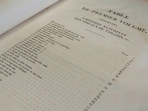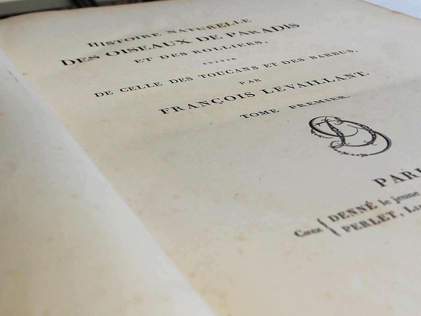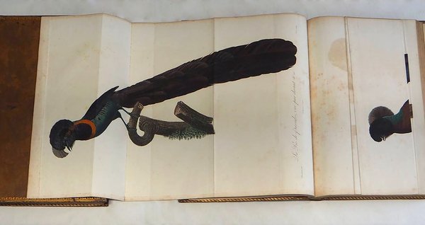 In folio grande (mm. 510 x 330), 2 volumi, elegante legatura in piena pelle coeva, cornice dorata ai piatti, dorso a cordoni con decorazioni di uccelli ai riquadri e titolo oro su due tasselli, tagli dorati, pp. (4),II,153; (4),II,133,(3); con 114 magnifiche tavole a colori che raffigurano, come dice Ronsil, "i più belli e i più esotici uccelli del mondo" (in ogni tavola veniva stampato a colori il ramo su cui l'uccello sta appollaiato ed il piumaggio; a mano veniva ritoccata a colori la parte principale del corpo). Le illustrazioni comprendono: 24 tavole dedicate agli uccelli del paradiso; 15 ai rolliers; 17 ai geais; 18 ai toucans; 24 ai barbus; 5 ai barbus tamatias; 3 ai barbacous e 8 ai jacamars.In questa celebrata opera, le tavole furono disegnate da Jacques Barraband, incise da Perée et Gremilliet, stampate a colori da Langlois et Rousset, e superbamente rifinite a mano. L'opera di Jacques Barraband (1768-1809), realizzata per Levaillant, rappresenta il momento più alto della sua carriera d'artista, considerato il miglior disegnatore di ornitologia della sua generazione. Produsse più di 300 bellissimi acquarelli per i libri di Levaillant.Cfr. Zimmer,II, p. 393 - Nissen,IVB, 559 - Ronsil,1780 - Graesse,IV,188 - Brunet,III,1033: Ouvrage d'une exécution magnifique - Benezit,I, p. 775.Qualche lieve fiorit. o alone ma complessivam. esemplare ben conservato, con ex-libris di Giovanni Treccani degli Alfieri."François Levaillant (17531824), è stato un esploratore, ornitologo e collezionista francese. Nacque a Paramaribo, capitale della Guyana Olandese (l'attuale Suriname), dove suo padre era console. Quando il padre tornò in Europa nel 1763, studiò storia naturale a Metz. Nel 1781 venne inviato per conto della Compagnia olandese delle Indie Orientali nella Provincia del Capo in Sudafrica, dove rimase a raccogliere esemplari fino al 1784. Nella zona effettuò due viaggi, uno ad est del Capo e l'altro a nord del fiume Orange (Gran Namaqualand). Al suo ritorno pubblicò Voyage dans l'intérieur de l'Afrique (1790) e Second voyage dans l'intérieur de l'Afrique, dans les années 1783-85 (1795), che furono tradotti in varie lingue. Pubblicò anche importanti opere di ornitologia quali Histoire naturelle des oiseaux d'Afrique (1796-1808, 6 volumi) e, assieme a Jacques Barraband, Histoire naturelle des oiseaux de paradis (1801-06).Grazie a questi viaggi fu in grado di inviare più di 2000 esemplari di uccelli a Jacob Temminck, che aveva finanziato la spedizione, e che furono studiati dal figlio Coenraad Jacob Temminck ed inclusi nella collezione del Museo di Storia Naturale di Leida (di cui fu il primo Direttore)". P.a.r.
