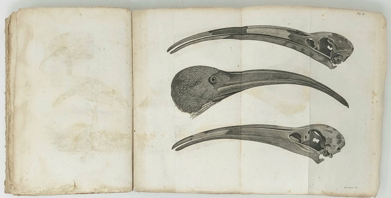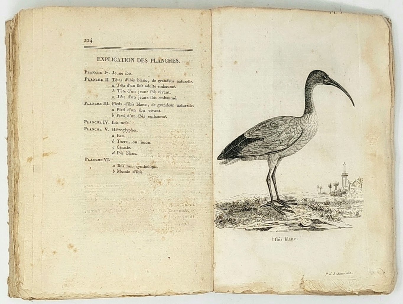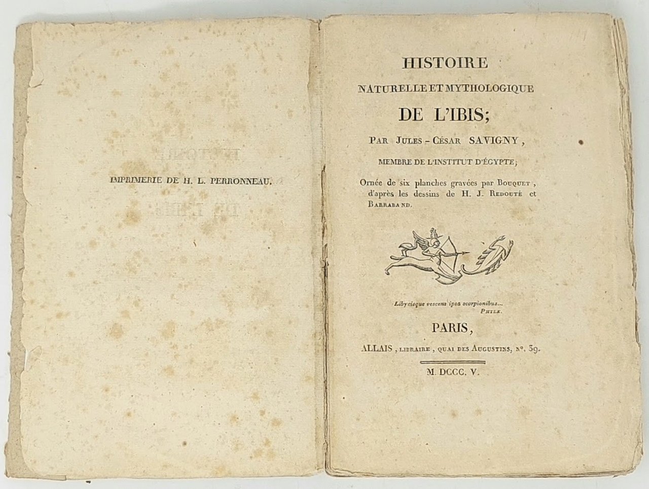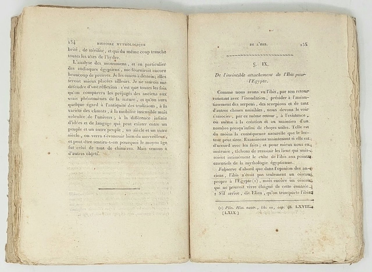 >in-8 (210x135 mm), pp. XIII, (1), 224, legatura in cartonato rustico coevo. Vignetta al titolo, corredato da sei importanti tavole incise f.t., raffiguranti l'ibis bianco, quello nero, il cranio e le zampe dell'uccello e alcuni disegni tratti da geroglifici, che furono ideate da H.J. Redouté e Barraband, due tra i più grandi illustratori di storia naturale del principio del XIX secolo; trasposte in rame da Bouquet. Prima edizione sulla storia mitologica e ornitologica dell'ibis ad opera del naturalista francese Savigny (1777-1851), che approfondì i due aspetti in modo parallelo, con particolare attenzione ai miti e ai culti legati all'uccello considerato sacro nell'antico Egitto. Raro. Buon esemplare, in barbe (leggera brunitura ad alcuni fogli e sporadiche lievi fioriture). Nissen, Vogelbücher 819. Larousse VI, 215-216.
