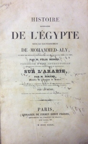 In-8 p. (mm. 201x125), mz. pelle coeva (lievi abrasioni), fregi e titolo oro al dorso, pp. XL,538, con 1 carta geografica (su 2) relativa a l'Arabie et pays circonvoisins (ma appartenente a un'ediz. del 1847). L'opera è précedée d'une introduction et suivie d'études géographiques et historiques sur l'Arabie, par M. Jomard. Accompagnée de la relation du voyage de Mohammed-Aly au Fazoql, d'une carte de l'Acyr et d'une carte générale d'Arabie par le meme; terminée par des consideration sur les affaires de l'Egypte.Frontesp., occhietto e alcune pagine con frasi anticamente mss. a penna; con fiorit., aloni più o meno pesanti e sottolineature.