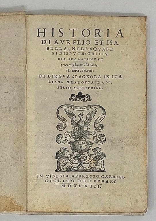 Historia di Aurelio et Isabella, nella quale si disputa: chi più dia occasione di peccare, l'huomo alla donna, o la donna a l'huomo. Di lingua spagnola in italiana tradotta da m. Lelio Aletiphilo