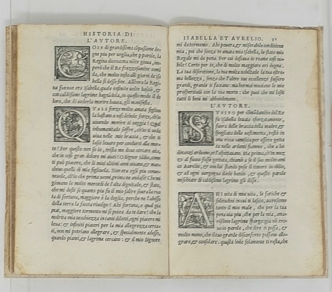 >in-8 piccolo (155x98 mm), ff. 49, carattere corsivo, impresa giolitina della Fenice al frontespizio, 44 grandi iniziali xilografiche figurate (30x30 mm). Legatura in carta decorata settecentesca. Precede il testo la "Lettera di Giovanni di Fiore, che già compose la seguente opera in lingua castigliana, alla sua signora". Seconda e non comune edizione del Giolito di questa fortunatissima opera di uno degli autori spagnoli più letti in Europa prima di Cervantes. La fama di Juan de Flores (ca. 1455-1525) è legata proprio al racconto di Grisel y Mirabella; pubblicata nel 1495, ebbe nel Cinquecento oltre 50 ristampe, ispirando Lope de Vega, John Fletcher e G. de Scudéry per parti delle loro opere; nonché l'Ariosto per l'episodio di Ginevra dell'Orlando Furioso. La storia dei due amanti, costretti al suicidio per salvare l'altro, ha un sottotesto fortemente femminista, e fu letta per lo più dalle donne. Questo stimolò riflessioni sul dibattito sui due generi, l'eguaglianza delle donne davanti alla legge e il loro diritto a un'istruzione superiore e la maggiore gravità della seduzione maschile o femminile: nella sfida dialettica sul tema l'autore parla attraverso Briseide che difende Mirabel e tutte le donne, in un'accorata accusa al potere maschile che condanna la vittima e salva lo stupratore. Il suo antagonista maschile è Torellas, in realtà una figura storica reale: poeta contemporaneo, noto per le violente posizioni misogine e in particolare per il celebre Maldecir de las mujeres. Questa novela sentimental esprime sia tutta la carica misogina della letteratura del tempo ma, forse involontariamente, esprime un'invettiva contro il patriarcato e rivendicazioni femministe ancora attuali. Buon esemplare, lievi fioriture della carta, per lo più marginali. Papanti, Novellieri Italiani, p. 9. Bongi, Annali, pp. 212-213. Manca a varie bibliografie.