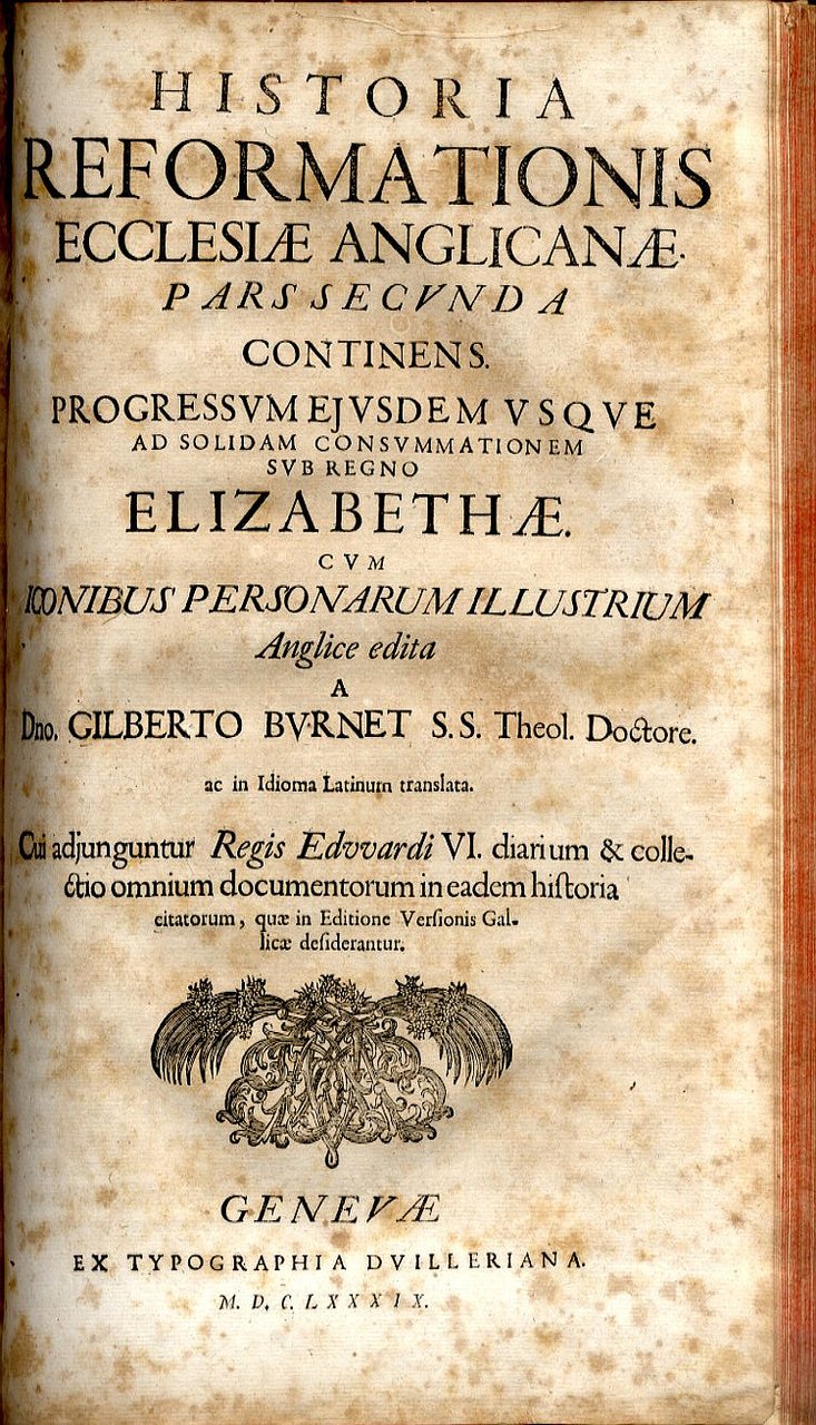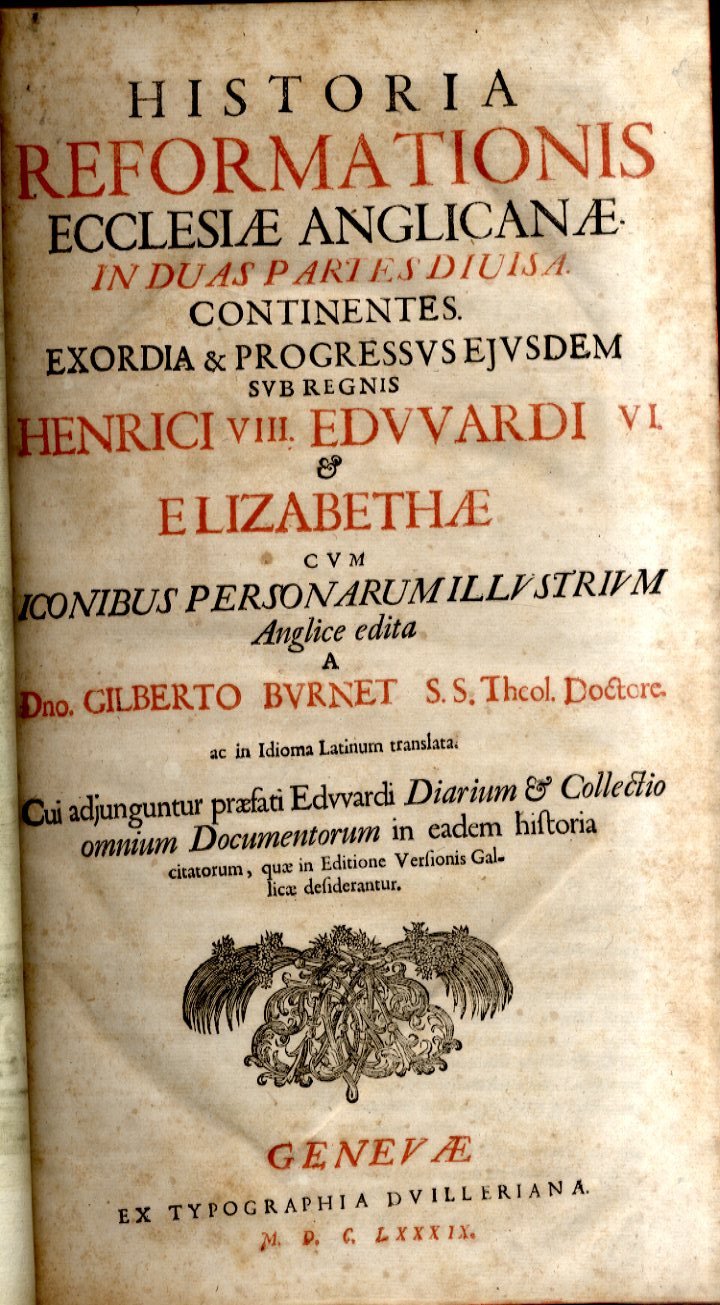 >Due volumi divisi in 4 parti, in-folio (350x200 mm.) legati in un unico volume. Parte prima pp. (12) 194, (8) - 172 (erroneamente 272), (4)- Parte seconda pp. 276,240. Antiporta riccamente incisi con le figure dei personaggi storici che animarono gli eveni storici dell'acceso scisma d'Inghilterra e altre 16 tavole incise su rame con i ritratti di Edoardo VIII, Caterina d' Aragona , Anna Bolena, Tomas Moore, ecc.. Legatura in pelle coeva titolo su tassello, tagli rossi, carta notevolmente brunita come spesso accade per i volumi del Seicento. Danni al dorso e alle cuffie. La seconda parte del primo volume contiene la ''Collectio Annalium ut & Athographorum cum aliis instrumentis ad priorem hujus Partem spectantibus''. L'edizione originale inglese della presente fondamentale e vasta opera sulla Riforma Anglicana era apparsa nel 1679-81 a Londra e completata da un'aggiunta nel 1715 anno in cui Gilberto Burnet scomparve (nacque a Edimburg nel 1643). Fu personaggio di straordinaria importanza e influenza nella vita sociale e religiosa dell'Inghilterra. La presente unica traduzione latina è assai più rara delle varie edizioni inglesi. Brunet, I, 1409. Encyclopedia Britannica, tomo IV, pp..434-435, offre esaurienti notizie sulla vita e l'opera di G.Burnet.