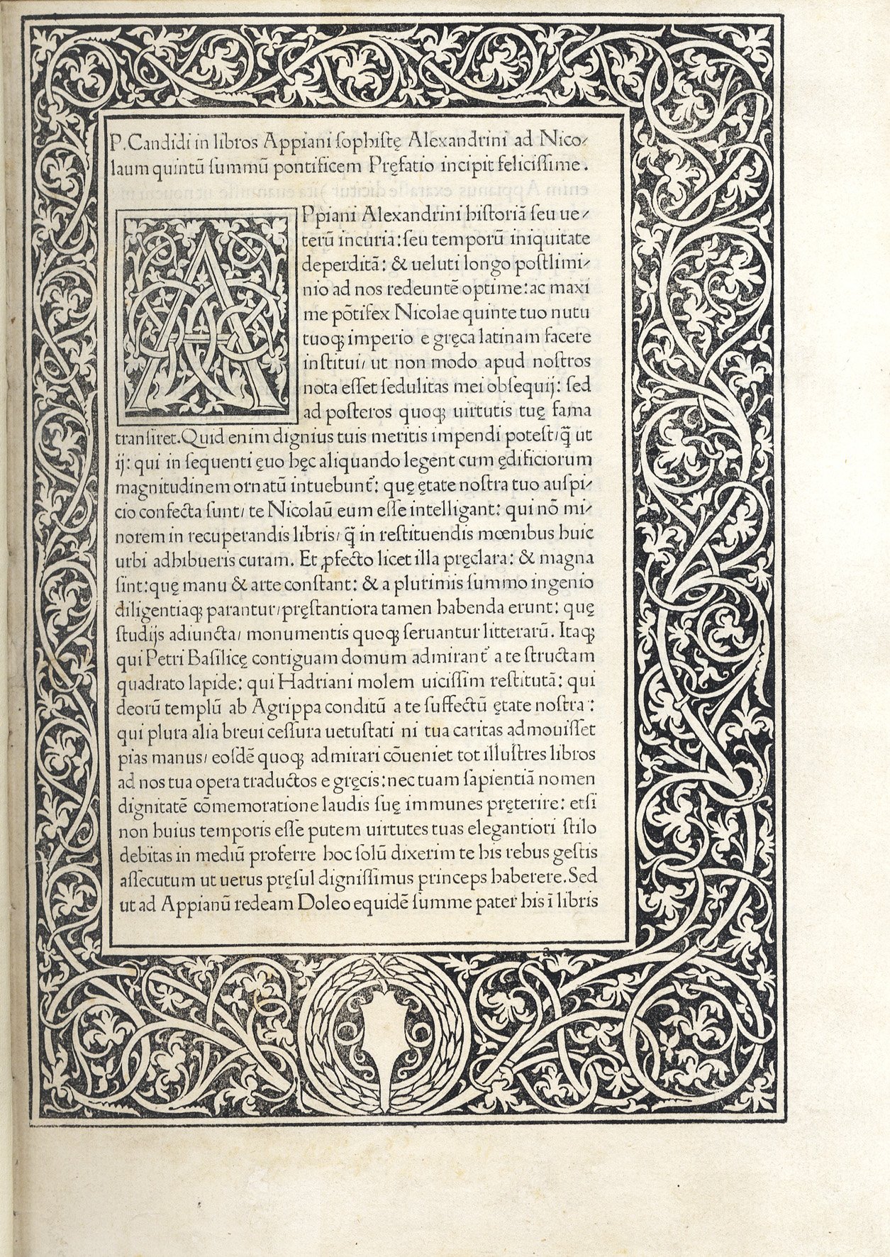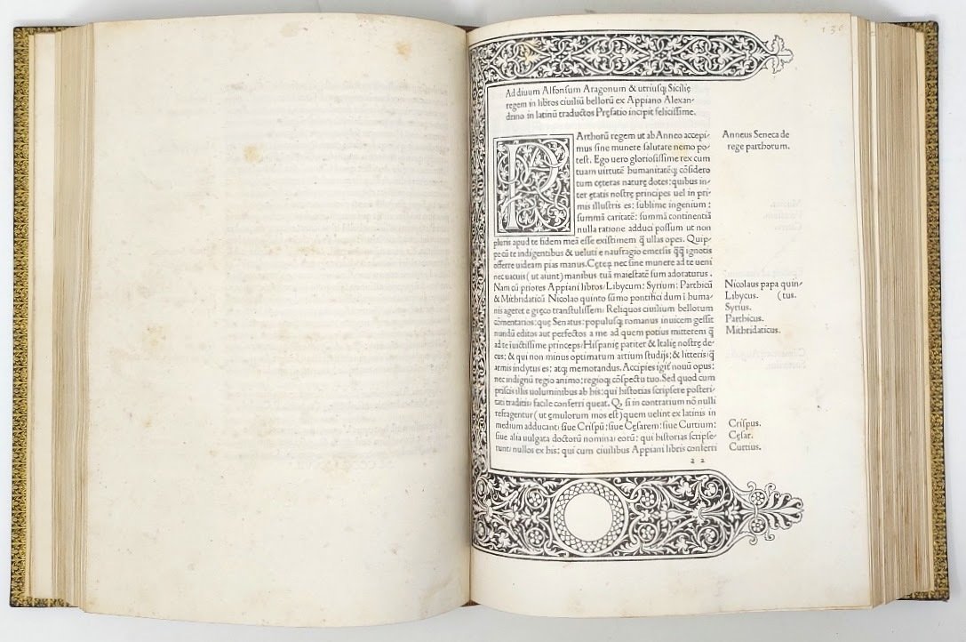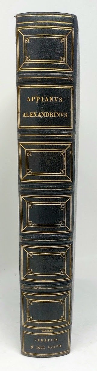 >2 parti in un vol. in-4 gr.(mm 291x220), ff. n.n. 131 su 132 mancando il primo f. bianco; 211 su 212 mancando il primo bianco. Attraente legatura d'amatore del XIX sec. in marocchino blu con riquadro a filetti oro sui piatti, dorso a 5 nervi con titolo e fregi oro, tagli dorati, dentelle int. I fogli che aprono ambedue le parti sono incorniciati dalla prima bordura ornamentale su fondo nero ad apparire in un testo a stampa (cfr. A.M. Hind, An Introduction to a History of Woodcut, New York, 1963, II, p. 458 e sgg.). Con 14 grandi iniziali xilografiche ornate, sempre su fondo nero; testo in nitidissimo car. tondo. Editio princeps della Historia Romana dello storico alessandrino Appiano nella traduzione latina dell'umanista pavese Pier Candido Decembrio. Il ''De bellis civilibus'' era già apparso nel 1472 preso i torchi di Vindelino da Spira; questa è la prima edizione collettiva delle due parti che tuttavia si trovano raramente riunite, come invece nel presente caso. È una delle prime edizioni veneziane di Ratdolt, dopo il Calendarium di Regiomontanus. In pochissimi esemplari solo la prima è stampata in rosso, mentre qui entrambe sono in nero. Redgrave, il bibliografo di Radolt, scrive: "A mio avviso ci sono pochi libri stampati di qualsiasi epoca che possono essere paragonati all'Appiano del 1477, con il suo splendido inchiostro nero, la sua carta simile alla pergamena e l'eccellenza rifinita della sua tipografia" (p.13). L'opera di Appiano, storico greco vissuto a Roma nel II sec. d.C., ebbe il merito di mutare l'usuale struttura annalistica della storiografia romana, dividendola sistematicamente per argomenti. La Storia Romana, conclusa intorno al 160 d.C., presenta un resoconto basato sulle storie locali dei vari popoli e paesi che componevano l'impero, a partire dalla loro sottomissione e incorporazione nell'impero stesso. Dei ventiquattro libri di cui era composta, ne sono rimasti integri solamente dieci (dal VI all'VIII e dal XI al XVII). Decembrio era stato allievo dello studioso bizantino Manuel Chrysoloras, dal quale aveva imparato il greco classico. Chrysoloras reintrodusse lingua e letteratura greche nell'Europa occidentale quando fu invitato a tenere una conferenza a Firenze nel 1397, anticipando così il Rinascimento. Portò con sé manoscritti di testi classici greci, oltre alla sua conoscenza della lingua, che in seguito codificò nel suo libro di grammatica Erotemata. La straordinaria produzione del Decembrio (gli sono attribuite centoventisette opere) si divide essenzialmente tra le traduzioni e le opere storiche. Tradusse dal greco in latino parte dell'Iliade, la Ciropedia di Senofonte, alcune Vite di Plutarco, le Storie di Appiano, la Repubblica di Platone; dal latino in italiano i Commentari di Giulio Cesare. Celebre incunabolo, uno dei primi libri che siano apparsi con ornamenti silografici ed il primo in assoluto su fondo nero. Stupendo esemplare a grandissimi margini, immacolato (lievissime macchie su pochi fogli). Al contropiatto ex libris "Ex museo Huthii", Henry Huth (1815-1878) fu membro della Philobiblion Society, collezionista noto per acquistare solo esemplari in eccellenti condizioni. La sua prestigiosa libreria fu alienata dopo la morte del figlio, nel 1910. BMC V, 244. Goff A-928. IGI 763. GW 2290. Pellechet 915. Polain 284. Essling 221. Sander 482: ''Les deux superbes bordures ornées d’arabesques blanches sur fond noir, sont demeurées comme un modèle de décoration typographique. L’Appianus est un des exemples les plus typiques de l’influence de la tradition de l’enluminure sur les livres imprimés, mais il est aussi la tentative la mieux réussie pour remplacer la miniature par l’ornamentation typographique''.