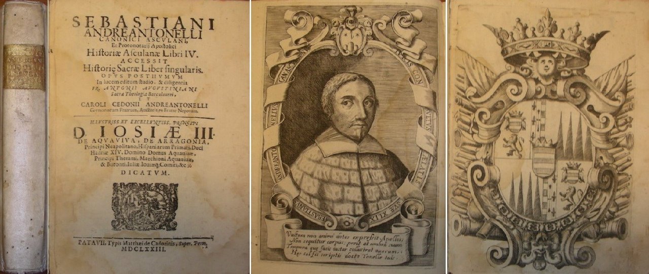 in-4 antico, pp. (36), 328, leg. p. perg. coeva con tass. e tit. oro al d., tagli spruzzati. Bell'antip. inc. in rame con stemma araldico. A pag.1 una tav. con bel ritr. dell'A. inc. in rame. Fregi, iniziali e testat. xilogr. Rara prima e unica ediz. di importante fonte per la storia civile ed ecclesiastica della città di Ascoli, pubblicata postuma dai nipoti di Sebastiano Andreantonelli (1594-1643), erudito storico e accademico ascolano. I primi tre libri raccolgo pagine di storia cittadina, l'ultimo le biografie di uomini illustri ascolani. Sappiamo che molti esemplari dell'opera, in seguito alla revisione operata dai nipoti, recano delle censure o alterazioni al testo, poche sono le copie con il testo originale integrale: la nostra è una di queste. Lozzi 189. Ranghiasci p.7, nota a: ". siccome bullivano allora nella città di Ascoli le Fazioni [.] che si sopprimessero tutti quegli esemplari che fosse stato possibile ritirare affine di nuovamente adulterarli. Quindi è che in una gran parte di essi furono affatto tolte le pagine 9-10-15-16-17-18-23-24 e con frode altrettante vennero sostituite [.] e questa storia si può riporre tra le rarissime, particolarmente gli esemplari meno viziati". Lieviss. gore marginali sulle prime e ultime cc. Bell'esempl. [091]