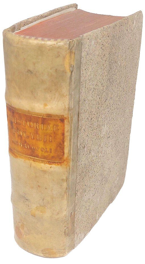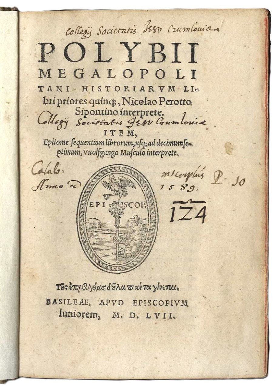 >in-8, pp. 860, ff. (22), legaura posteriore in mezza pergamena, titolo in oro su tassello dipinto al dorso a nervi, tagli rossi. Bel carattere corsivo, impresa tipografica di Episcopius sul titolo ed altra diversa in fine, iniziali istoriate. Precede il proemio di N. Perotti al Pontefice Niccolò V. Rara edizione dei primi cinque libri integri e dei testi supertiti dei rimanenti 12 libri delle "storie" di Polibio, quanto ci resta dell'opera che in 40 libri abbracciava gli avvenimenti dal 264 al 146 a.C., periodo cruciale per l'affermazione di Roma come «caput mundi». L'autore (205ca.-120 a. C.), nativo di Megalopoli in Arcadia, fu uomo d'affari e di guerra, politico e sommo storico, tanto da essere considerato il padre della storia, modernamente intesa come scienza. I 22 fogli finali contengono l'esteso ''Rerum et Verborum in Polybium memorabilium, Index''. Buon esemplare (tre ex-libris mss. di mano coeva sul titolo) Adams P-1809.