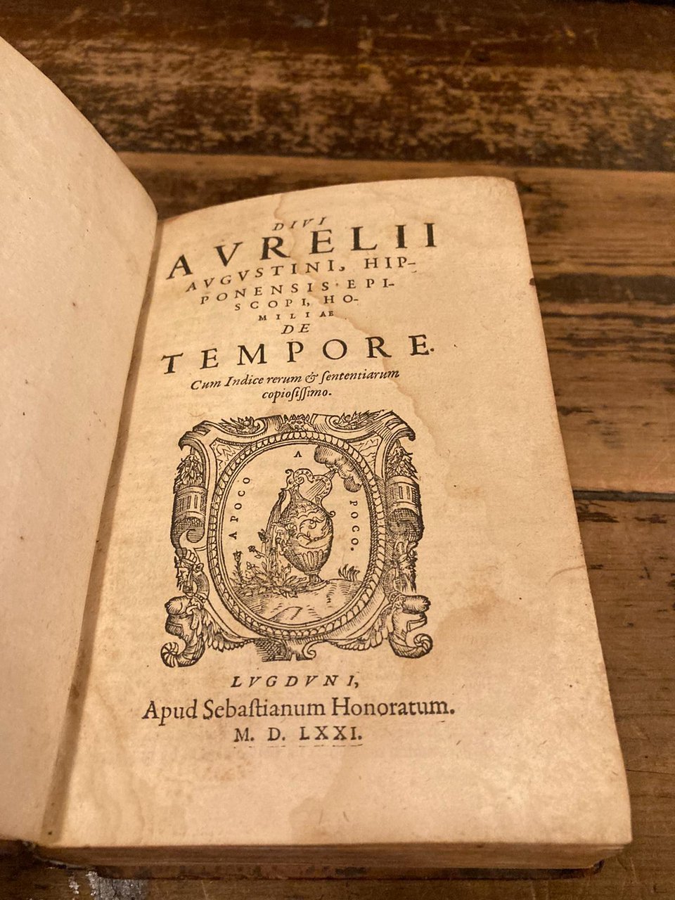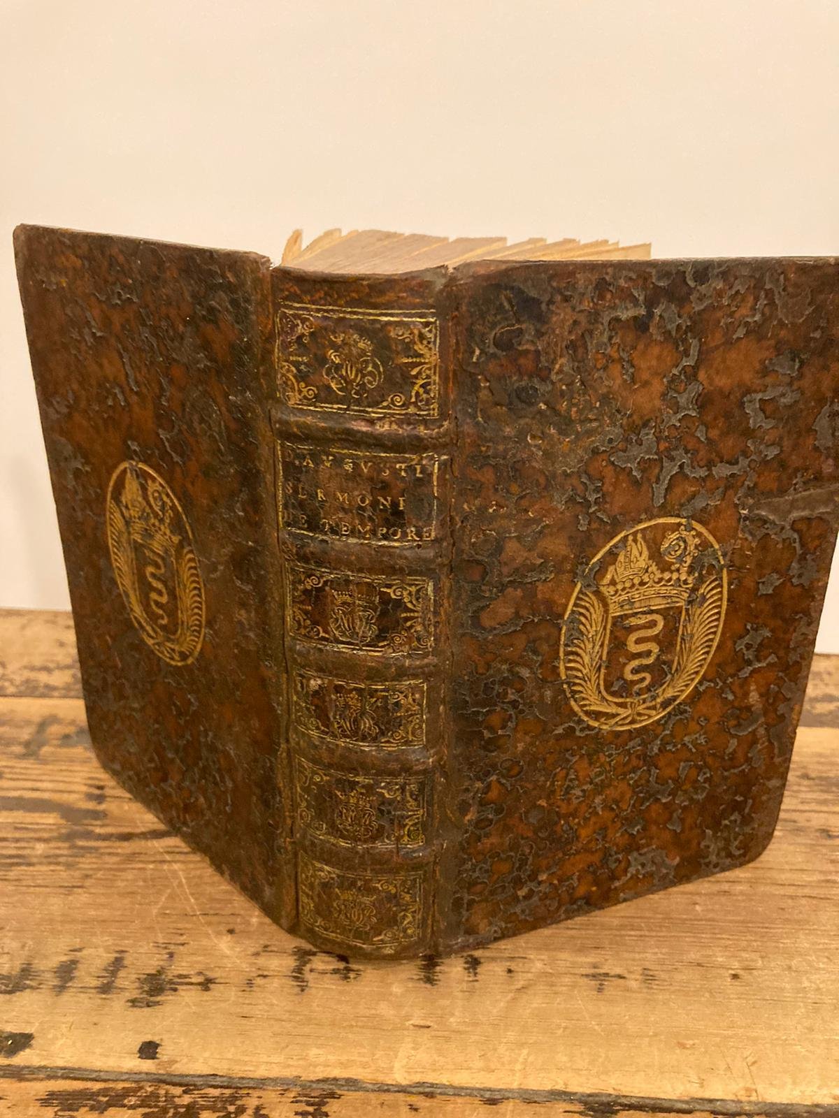 In-8° antico piccolo (16.5x10 cm), bella legatura secentesca in piena pelle lavorata craquelé con in ovale ai piatti armi viscontee incise a secco e dorate, fregi dorati ai fili di testa e di piede dei piatti, tagli rossi. Pp 752, (46), al frontespizio entro cornice architettonica con fregi fitomorfi e grottesche bella marca editoriale allegorica (anfora inclinata da cui cadono gocce su una pianta con motto a poco a poco), capolèttere incisi. La marca editoriale molto simile a quella dell'editore veneto Giorgio Angelieri farebbe pensare ad una delle tipiche contraffazioni lionesi, dove ovviamente non poteva essere protetto il priviliegio di stampa. Lievi gore alle prime 18 pp, alle pp 555-602 e alle carte di indici non numerate; alcune carte lievemente brunite o arrossate. Leggermente rifilato. Buon esemplare. Rara edizione dei 256 sermoni dedicati al tempo liturgico ovvero alle festività religiose del vescovo d' Ippona. Sant'Agostino nasce in Africa a Tagaste, nella Numidia - attualmente Souk-Ahras in Algeria - il 13 novembre 354 da una famiglia di piccoli proprietari terrieri. Dalla madre riceve un'educazione cristiana, ma dopo aver letto l'Ortensio di Cicerone abbraccia la filosofia aderendo al manicheismo. Risale al 387 il viaggio a Milano, citta' in cui conosce sant'Ambrogio. L'incontro si rivela importante per il cammino di fede di Agostino: e' da Ambrogio che riceve il battesimo. Successivamente ritorna in Africa con il desiderio di creare una comunita' di monaci; dopo la morte della madre si reca a Ippona, dove viene ordinato sacerdote e vescovo. Le sue opere teologiche, mistiche, filosofiche e polemiche - quest'ultime riflettono l'intensa lotta che Agostino intraprende contro le eresie, a cui dedica parte della sua vita - sono tutt'ora studiate. Agostino per il suo pensiero, racchiuso in testi come Confessioni' o Citta' di Dio', ha meritato il titolo di Dottore della Chiesa. Mentre Ippona e' assediata dai Vandali, nel 429 il santo si ammala gravemente. Muore il 28 agosto del 430 all'eta' di 76 anni.