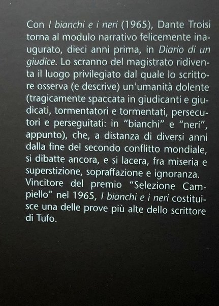Con "I bianchi e i neri" (1965), Dante Troisi torna al modulo narrativo felicemente inaugurato, dieci anni prima, in "Diario di un giudice". Lo scranno del magistrato ridiventa il luogo privilegiato dal quale lo scrittore osserva (e descrive) un’umanità dolente (tragicamente spaccata in giudicanti e giudicati, tormentatori e tormentati, persecutori e perseguitati: in “bianchi” e “neri”, appunto), che, a distanza di diversi anni dalla fine del secondo conflitto mondiale, si dibatte ancora, e si lacera, fra miseria e superstizione, sopraffazione e ignoranza. Vincitore del premio “Selezione Campiello” nel 1965, "I bianchi e i neri" costituisce una delle prove più alte dello scrittore di Tufo.