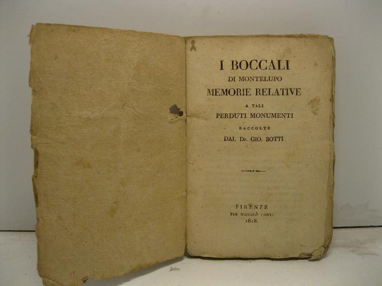 In 24, pp. 215 + (1) di errata. Intonso. Lieve mancanza al p. ant. Br. muta coeva. Interessante opera che ripercorre la storia della lavorazione della ceramica di Montelupo presso Firenze con particolare riferimento ai famosi boccali decorati andati perduti. I boccali di Montelupo, insieme a vasi e piatti, modellati e decorati nella cittadina, percorsero a partire dal XII secolo le vie dei piu' importanti mercati d'Europa.