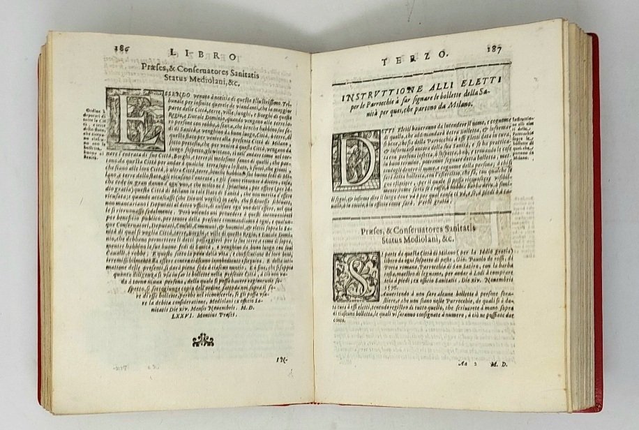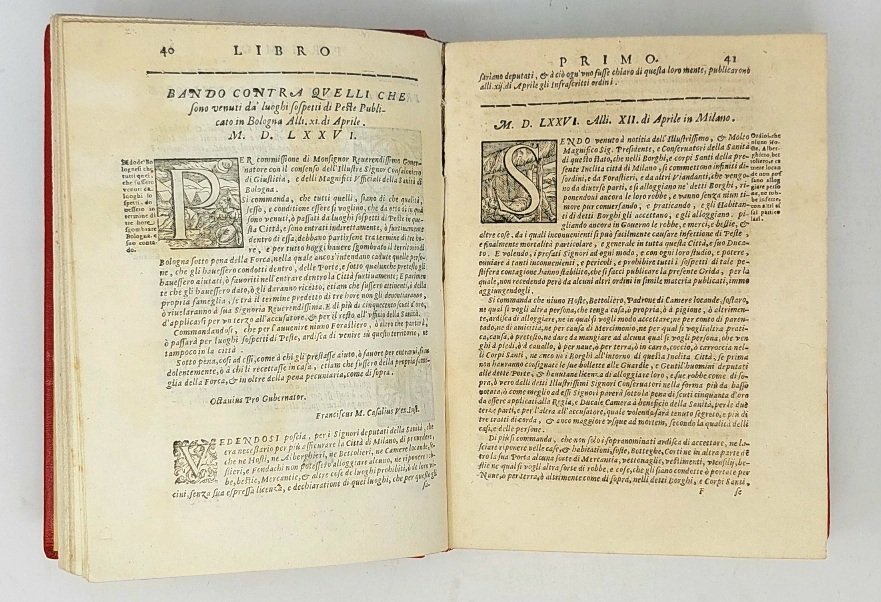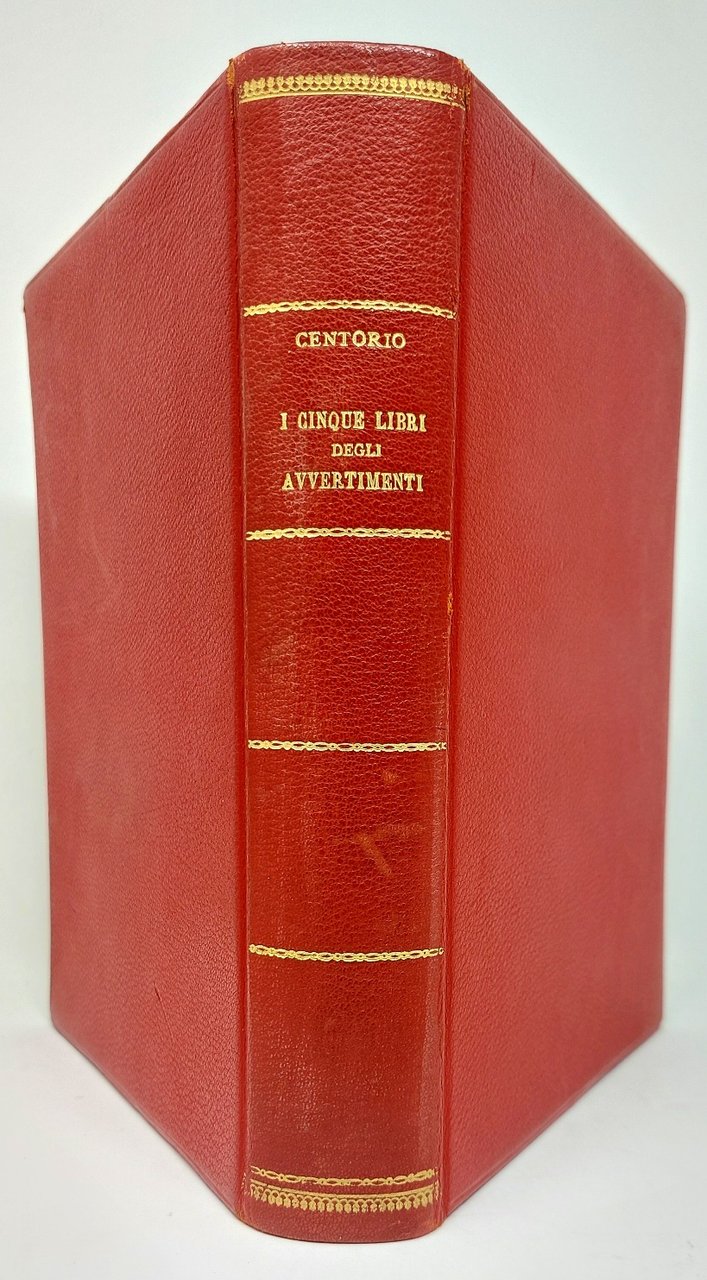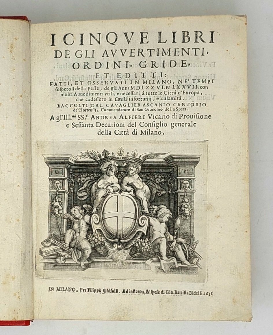 >in-4 (220x160 mm), pp. (24), 380, leg. moderna in marocchino rosso, titolo e fregi oro al dorso. Vignetta con stemma di Milano inc. sul tit., fregi e numerose iniz. silogr., testo in car. corsivo. Dedica di G.B. Bidelli ad Andrea Alfieri, vicario di Provisione, ed ai 60 Decurioni del Consiglio generale di Milano; in essa si avverte che la presente ristampa dell'opera del Centorio (dopo la prima del 1579) venne eseguita in occasione della famosa peste del 1630 (quella dei ''Promessi Sposi''), che rimise in vigore le prescrizioni adottate nelle pestilenze precedenti. «I documenti sono organizzati e poi collegati tra loro in modo da offrire un quadro di quanto avvenne in quelle circostanze e di quanto fu fatto dalle autorità; così si spiega la ristampa milanese di quest'opera fatta durante la peste del 1630-31» (D.B.It. XXIII, pp. 609-611). Opera importante e rara, impressa anche come vademecum per altre città europee che fossero state colpite dalla peste, fu molto apprezzata dai contemporanei. Buon esemplare, fresco (leggera ed uniforme brunitura della carta su alcuni fogli, antico rinforzo al margine interno del quaderno Bb). Cat. Senato IV, 321. Argelati I, I, 410. Predari 284. Cat. Hoepli 629. STC., XVII sec., 216.