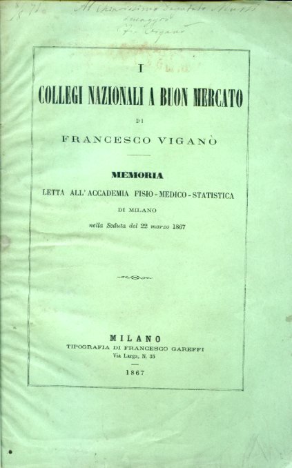 I Collegi Nazionali a buon mercato. Memoria letta all'Accademia Fisio - Medico - Statistica di Milano nella Seduta del 22 marzo 1867 | Libros antiguos y modernos | Viganò Francesco