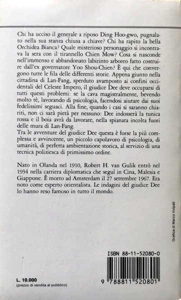 Soggetti: Narrativa, Letteratura contemporanea, Mistero, Gialli, Religione, Spiritualità, Polizieschi, Orientalismo, Ambiente cinese, Romanzi con il giudice Dee, Racconti, Orientalisti olandesi, Ti sen Chieh, Cina, Tang, Criminologia, Sherlock Holmes, Delitti, Omicidi, Soluzioni, Intreccio, Processi, Confucio, Libri Vintage, fuori catalogo, Personaggi, Campana, Psicologia, Romanzo storico, Tribunale, Tempio, Oro cinese, 670 d. C., Predoni, Esecuzioni, Pagoda, Mistery, Casi giudiziari, Yoo Shou-Chien, Ding Hoo-gwo, Orchidea Bianca, Celeste Impero, Chien Mow, Fiction, Contemporary Literature, Religion, Spirituality, Police Action, Orientalism, Chinese Environment, Novels with Judge Dee, Tales, Dutch Orientalists, China, Criminology, Crimes, Murders, Solutions, Weaving, Processes, Confucius, Books out of print, Characters, Bell, Psychology, Historical novel, Tribunal, Temple, Chinese Gold, Marauders, Executions, Court Cases, White Orchid, Heavenly Empire, Fantasy