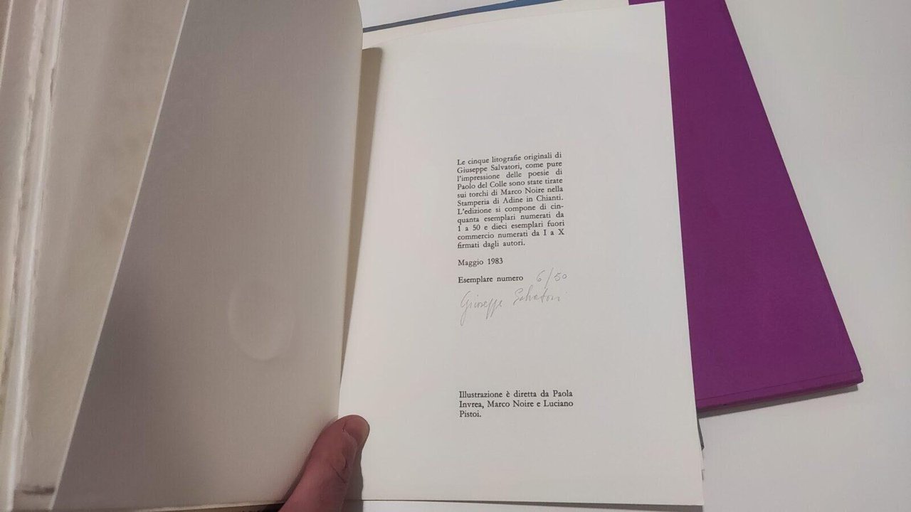 Giuseppe Salvatori, Paolo del Colle I Giorni Illustrazione 2 esemplare 6/50 in fogli sciolti Prezioso libro d'artista curato da Illustrazione (Paola Invrea, Marco Noire, Luciano Pistoi). Contiene 5 litografie originali di Giuseppe Salvatori (firma al colphon) e alcune poesie di Paolo del Colle. Tirati in soli 50 esemplari sono oggi dei pezzi quasi unici. Libro in ottime condizioni, minimi segni del tempo. Non esitate a contattarci per altre foto o richieste. Saremo lieti di soddisfare ogni vostra esigenza.