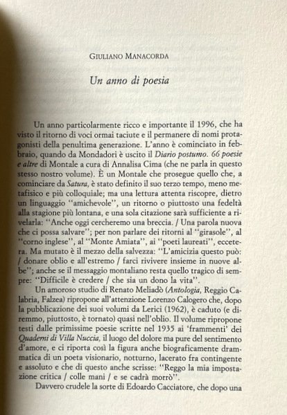 Soggetti: Poesia, Poeti italiani, Anni Novanta, Raccolte poetiche, Poesie, Antologie, Critica letteraria, Bibliografia, Rassegne, Studi letterari, Letteratura Contemporanea, Agrolimoni, Poeti minori, Inediti, Annalisa Cima, Eugenio Montale, Diario Postumo, Poesie civili, Lorenzo Calogero, Edoardo Cacciatore, Riviste, Saggi, Libri scolastici, Michael Palma, Paolo Giovannetti, Antonella Calzolari, Roberto Denti, Fabio Doplicher, Filippo Tommaso Marinetti, Rodolfo Di Blasio, Matteo Lefèvre, Clemente Di Leo, Massimo Bacigalupo, Seamus Heaney, Anna Maria Ortese, Cinzia Monti, Marcello, Vaglio, Vittorio Sereni, Libri Vintage Fuori catalogo, Opere generali, Recensioni, Edizioni critiche, Schede, Maria Luisa Spaziani, Vittorio Spinazzola, Giovanni Tesio, Cesare Segre, Francesco Scaramozzino, Benito Sablone, Umberto Saba, Salinari, Sansone, Shakespeare, Andrea Zanzotto, Clelia Martignoni, Mazzoni, Pier Vincenzo Mengaldo, Alda Merini, Attilio Momigliano, Mario Pazzaglia, Pascoli, Giovanni Raboni, Petronio, Petrarca, Ruggero Jacobbi, Leopardi, Luperini, Mario Luzi, Hermann Grosser, Giovanni Giudici, Ferroni, Guglielmino, Remo Ceserani, Contini, Dante, Giorgio Caproni, Lydia De Federicis, De Signoribus, Dario Bellezza, Bellini, Baldi, Attilio Bertolucci, Toti Scialoja, Poetry, Italian Poets, Nineties, Poetry Collections, Poems, Anthologies, Literary Criticism, Bibliography, Reviews, Literary Studies, Contemporary Literature, Minor Poets, Unpublished, Posthumous Diary, Civil Poems, Magazines, Essays, School Books, Out of print Books, General works, Reviews, Critical editions, Cards